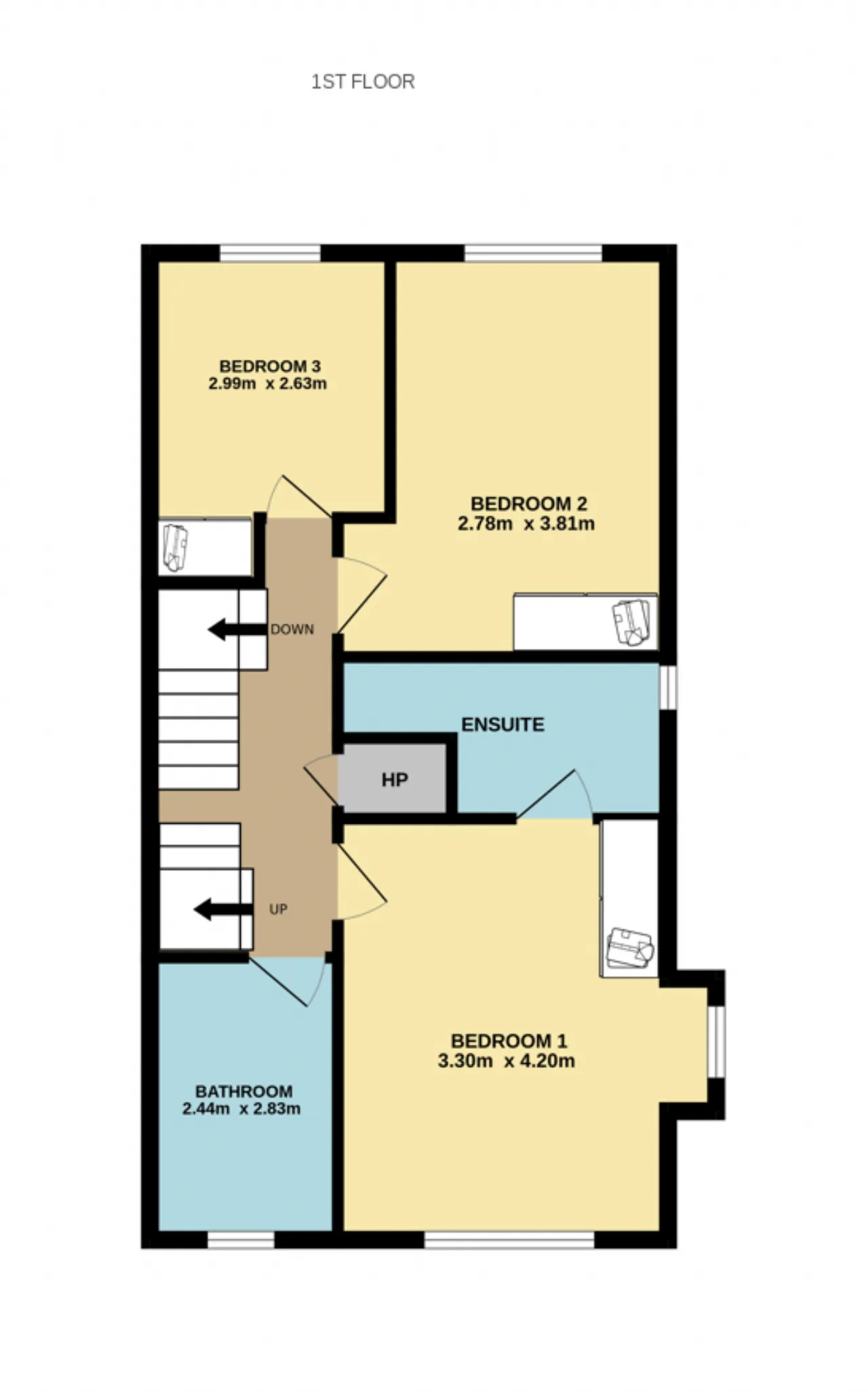 Bedroom 1 3.30m x 4.20m A spacious double bedroom featuring built-in wardrobes and a gable bay that provides an ideal spot for a dressing table. This room also benefits from a private ensuite bathroom for added comfort and convenience.