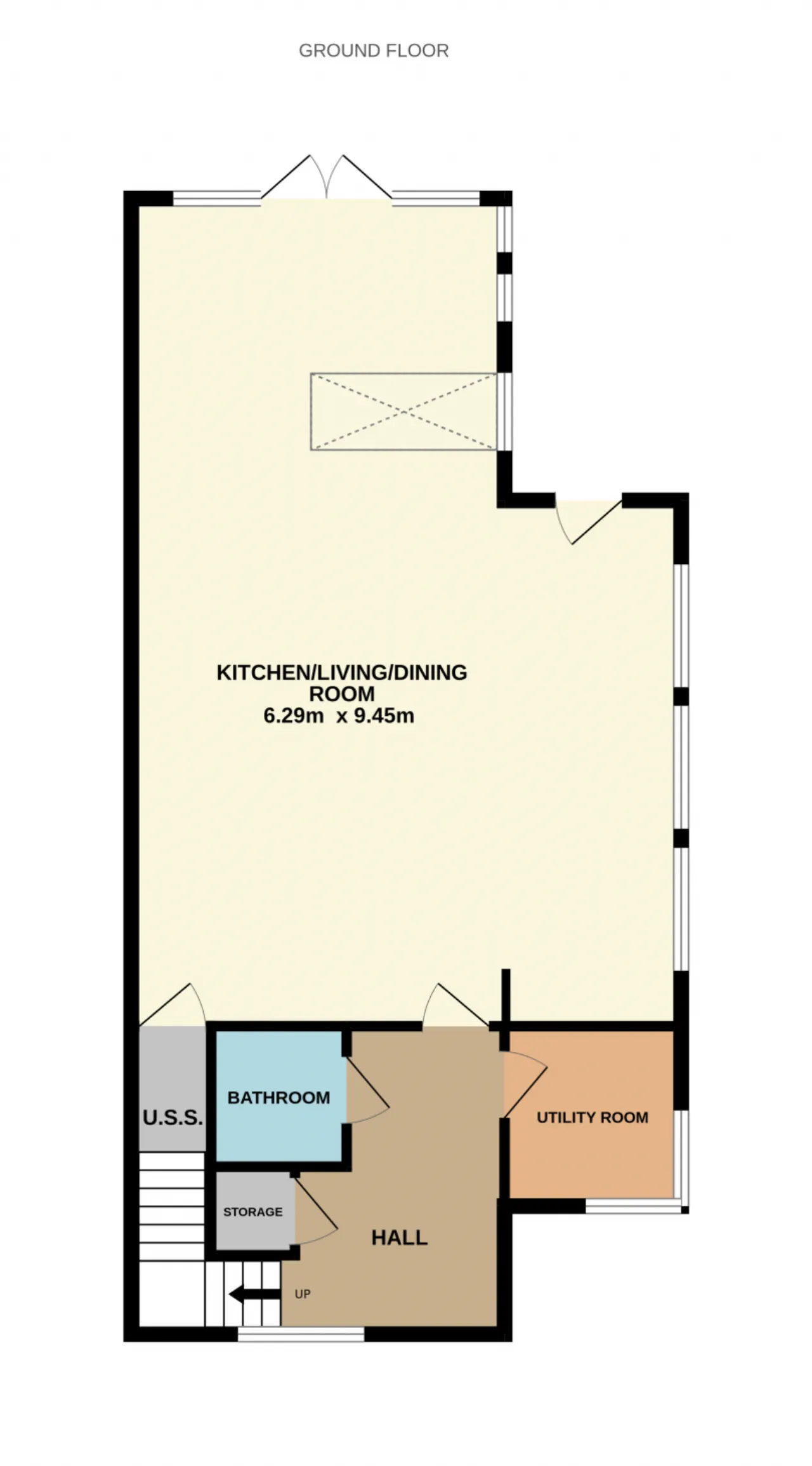 Kitchen/Living/Dining Room 6.29m x 9.45m Tiled floor, Zanussi hob, Indesit oven, Zanussi fridge freezer, extractor fan, stainless steel sink, skylight, built-in kitchen units and island.