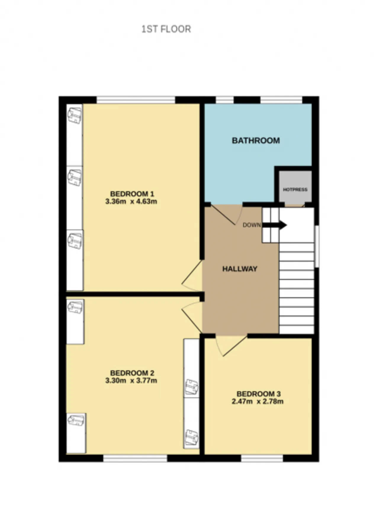Bedroom 1 3.36m x 4.63m Double bedroom with full-length wardrobes, radiator, carpet flooring, attic access, and window to rear.