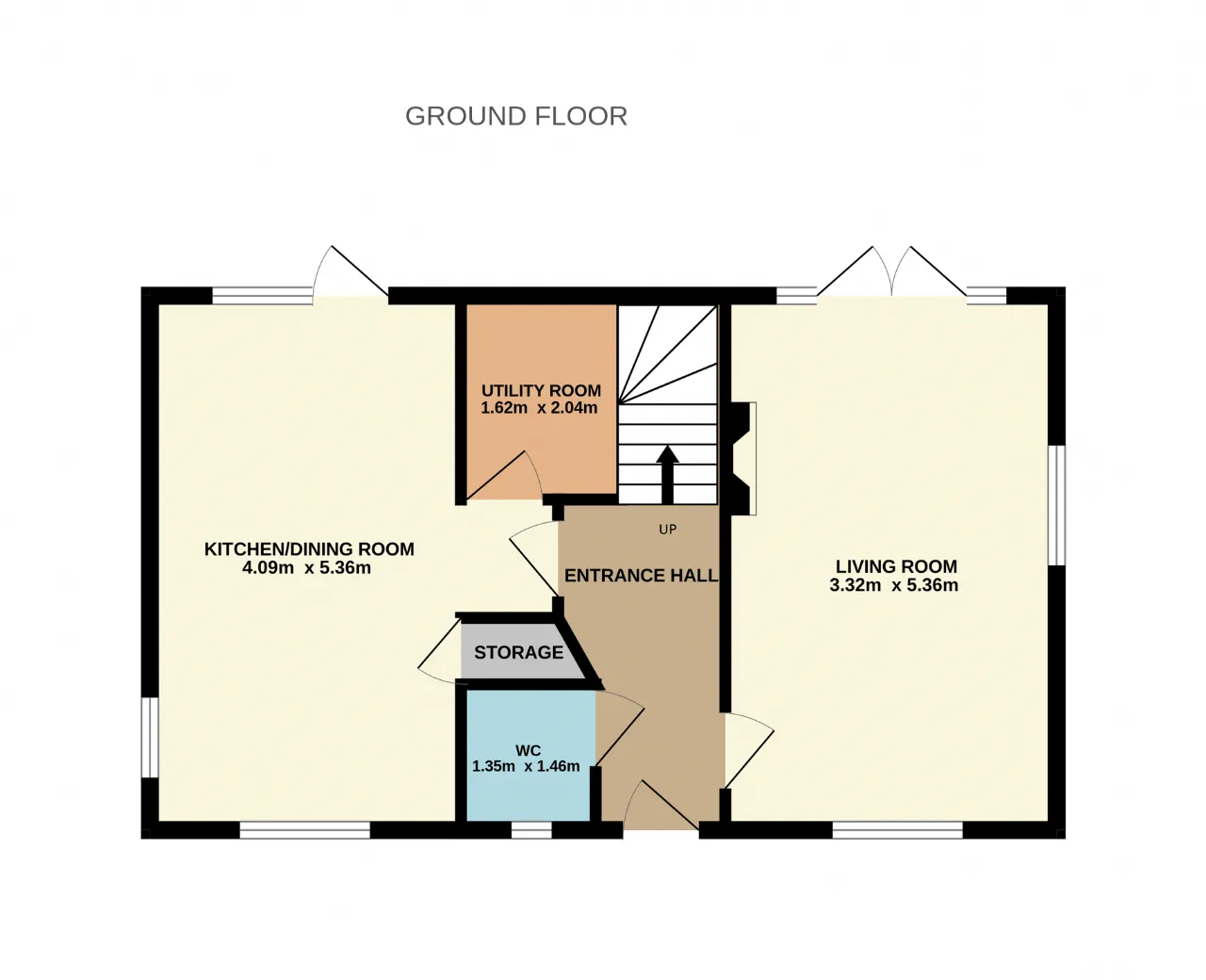 Living Room 3.32m x 5.36m Solid timber flooring, windows to front, side and French doors to rear, ceiling coving and gas effect coal fire, ample storage space via under stairs section.