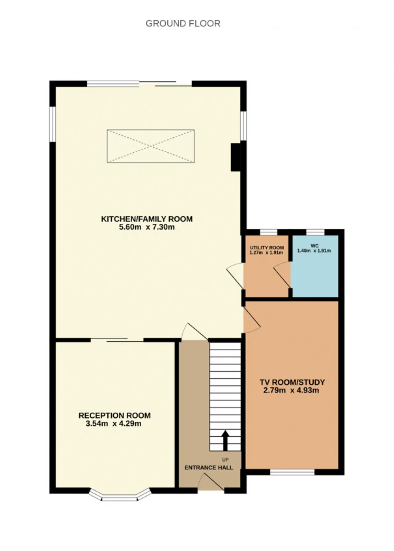 Guest w.c. 1.40m x 1.91m Tiled flooring, w.c., wash hand basin with pedestal window to rear and integrated storage.