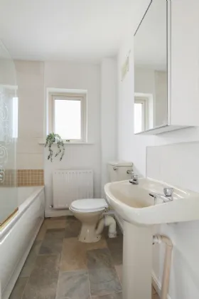 This home offers bright, well-proportioned living spaces. The ground floor comprises a welcoming living room to the front with a large picture window and feature fireplace, creating a warm and inviting atmosphere. To the rear, a generous kitchen/dining room stretches the full width of the house and has a floor to ceiling bay leading out the private rear garden —an ideal space for family life and entertaining. The kitchen is well-appointed with floor and eye-level units, and includes the washing machine, dishwasher, fridge freezer, oven, hob and extractor fan and plenty of storage. A guest W.C. completes the accommodation on this level.