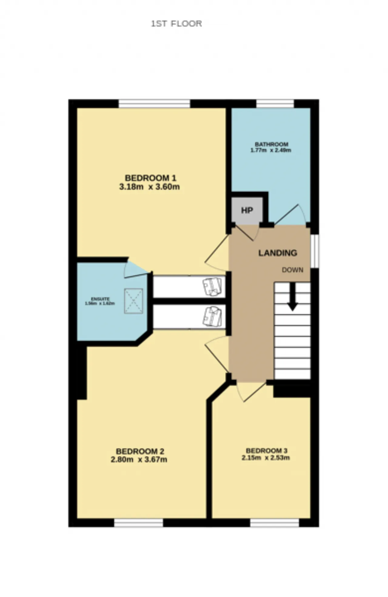 Bedroom 1 3.18m x 3.60m A spacious double bedroom with built-in wardrobes and a private ensuite.
