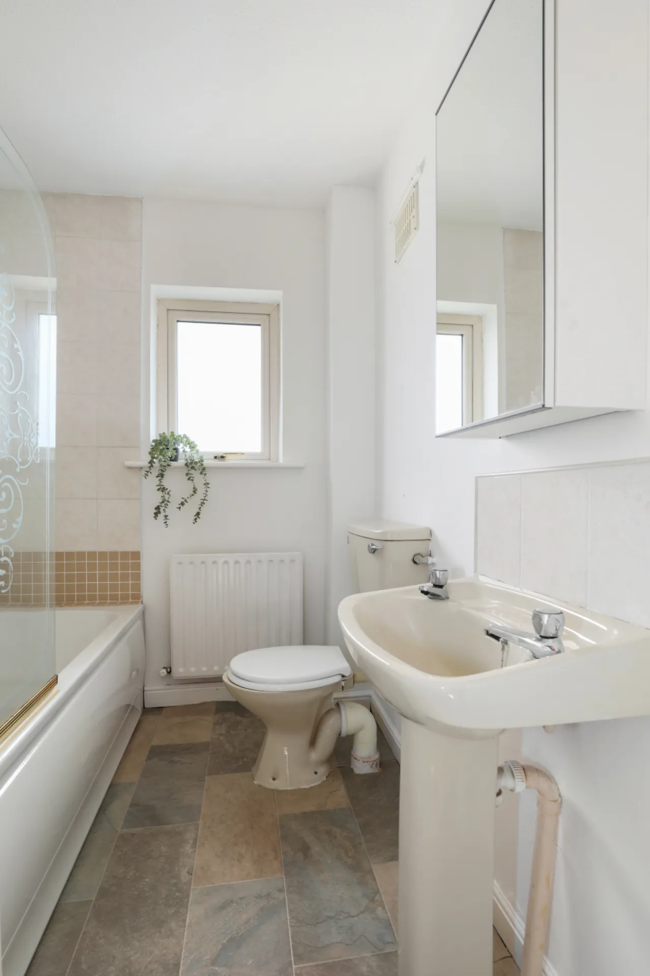 Bathroom 1.77m x 2.49m Comprises a W.C., wash hand basin, and bath with tiled surround, complemented by a Mira electric shower.