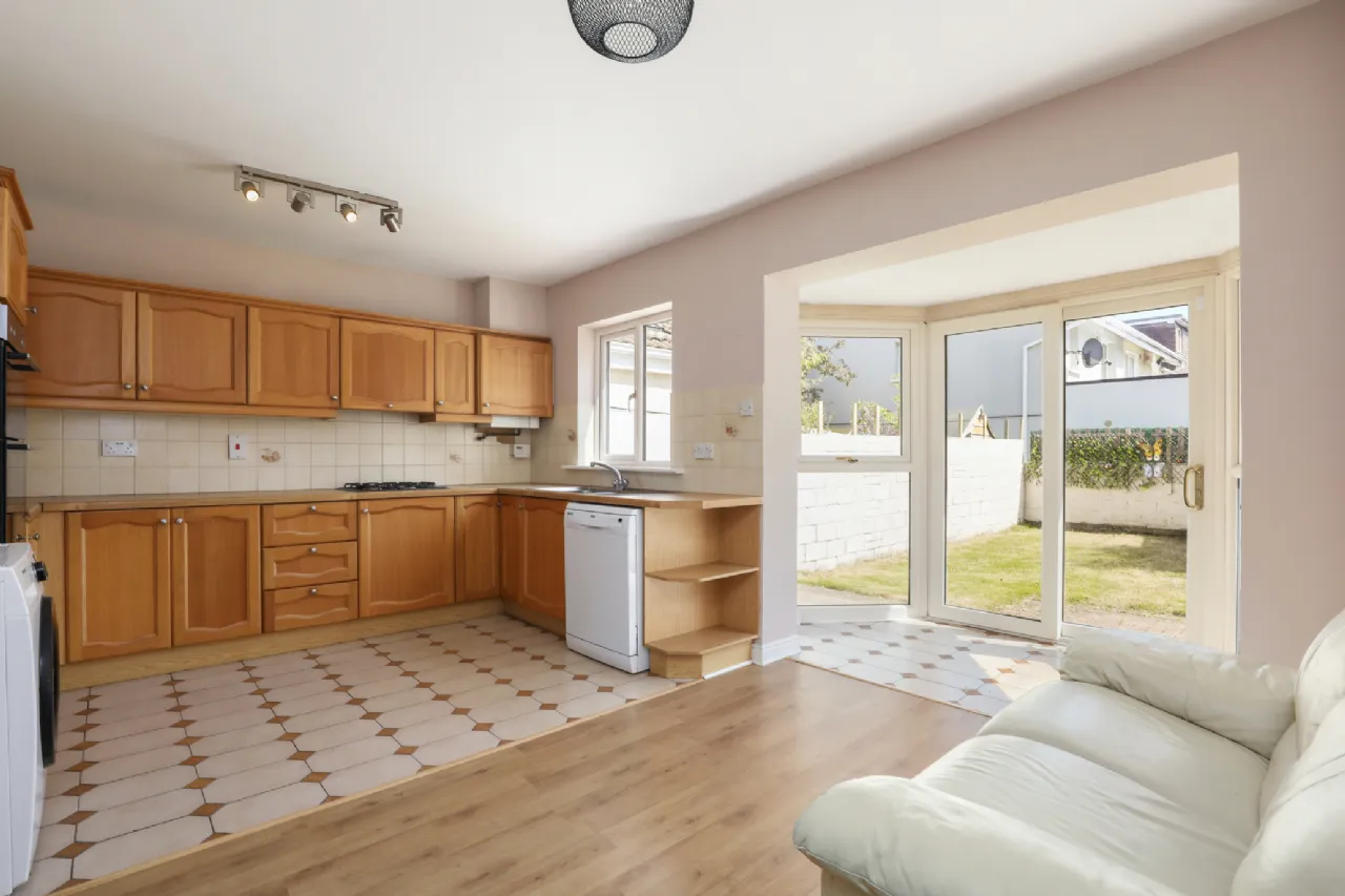 Kitchen / Dining Room 5.00m x 3.48m Extending the full width of the house, this light-filled space includes a floor-to-ceiling glazed bay with doors opening onto a private rear garden, enjoying morning and afternoon sunshine. The dining area has laminated flooring that continues from the hallway, while the kitchen and bay area are tiled. The fully fitted kitchen includes floor and eye-level units, a built-in double oven, gas hob, extractor fan, washing machine, dishwasher, and an American-style fridge freezer.
