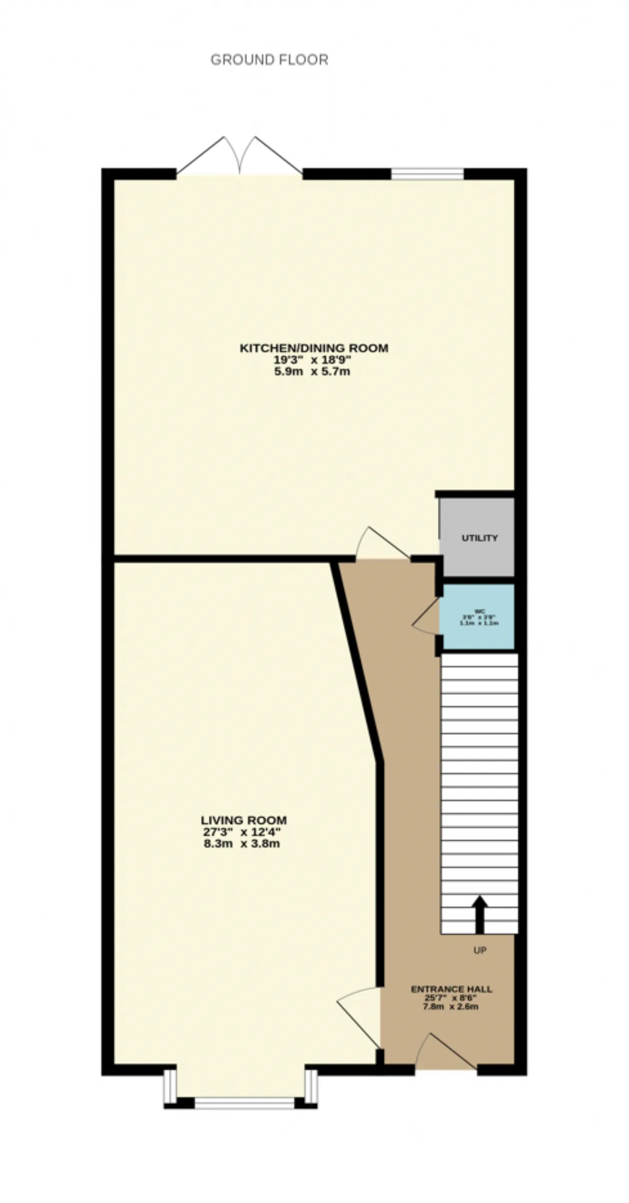 Upstairs, there are five spacious bedrooms (two are en-suite) and a family bathroom. The principal bedroom spans the third floor of the house and has the added feature of a walk-in wardrobe with hanging units and additional storage space.