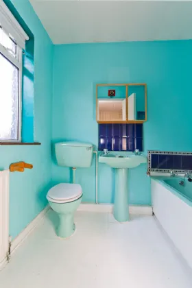Bathroom The fully tiled family bathroom comprises a WC, wash hand basin with fitted mirror and bath.
