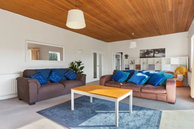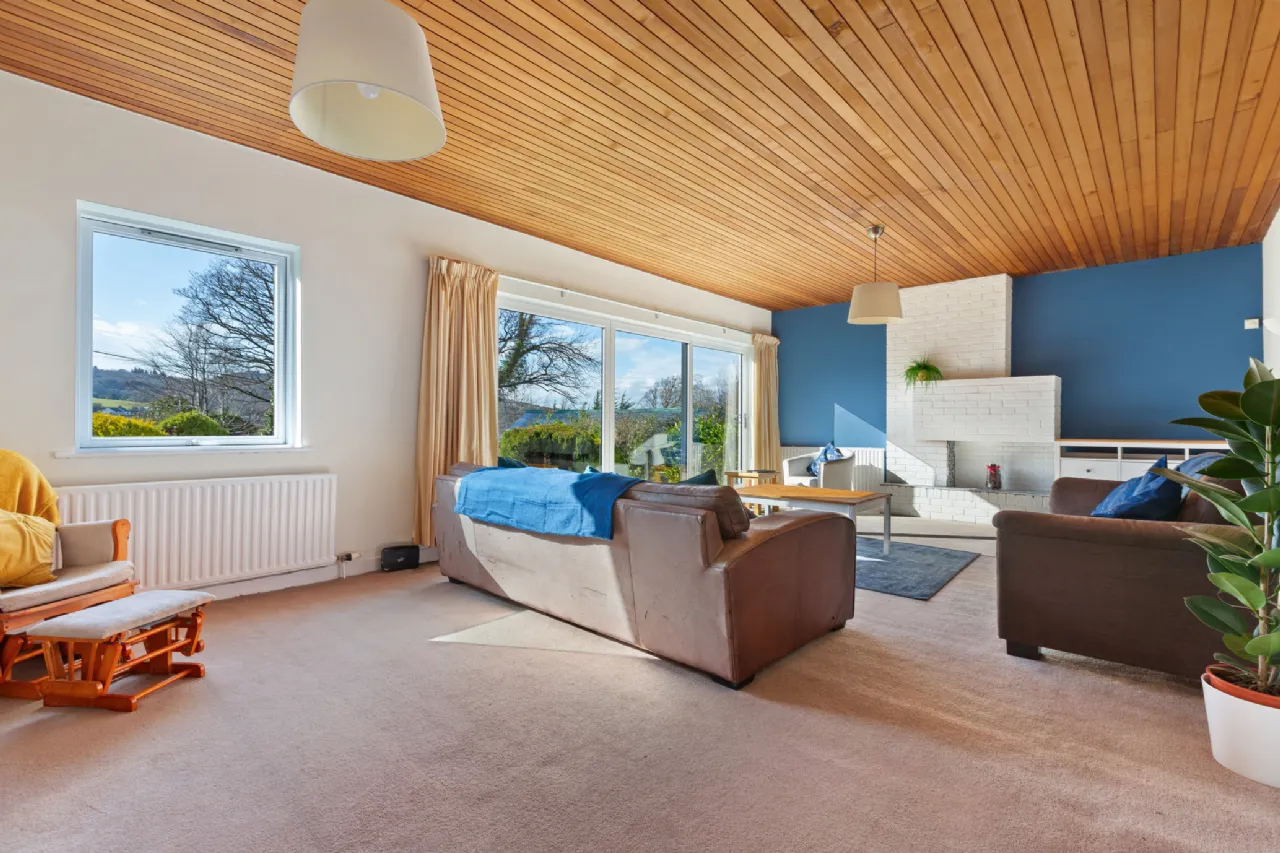 The living room is a standout feature of the home, offering large sliding doors that open to stunning panoramic views of the Dublin hills. This room is further enhanced by a unique Le Droff-style brick chimney breast and a wood-panelled ceiling, creating a warm and inviting atmosphere. Across the hall, the spacious open plan kitchen / dining room / family room is certainly the hub of the home and offers great space for family living and entertaining. The kitchen has been newly fitted, adding a contemporary and modern feel to this quaint home, There is a wood burning stove in the family room giving it a homely cosy feel and two sets of sliding doors that open to the beautifully maintained rear garden.