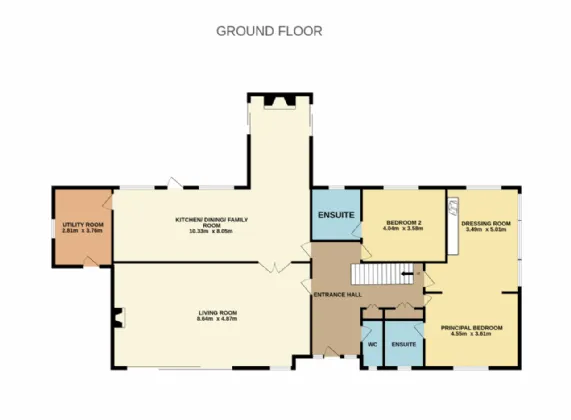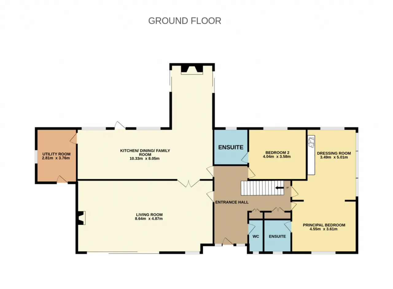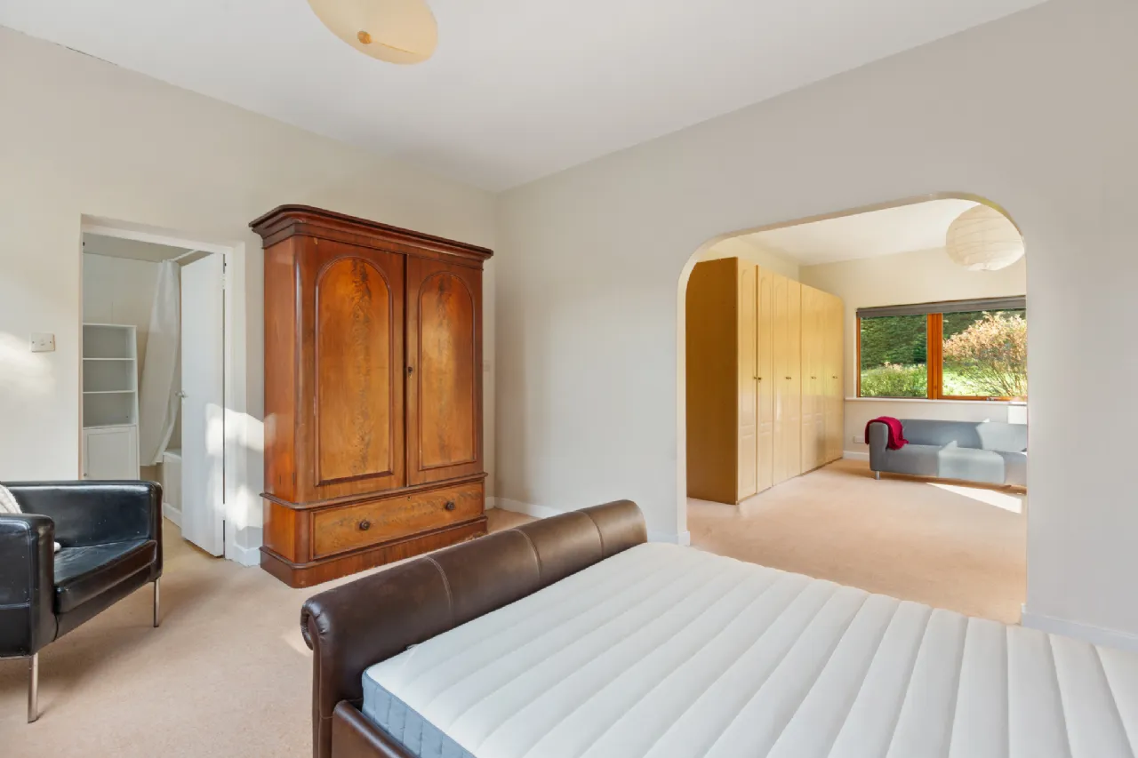 Princple Bedroom 4.55m x 3.61m This impressive bedroom spans the front to the back of the house and boasts a triple aspect, capturing light and views from the front, back, and side. It’s a spacious double room with an ensuite shower room and a large dressing area featuring extensive wardrobes.