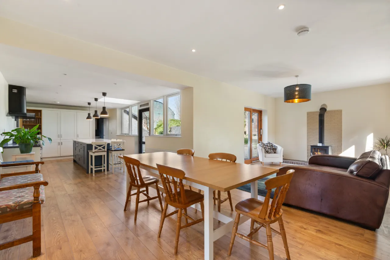 Kitchen/Dining/Family Room 10.33m x 8.05m Designed by the current owners to create a functional family space, this open-plan area is perfect for both everyday family life and entertaining. The room features a laminate timber floor and a fully fitted kitchen, complete with a range of floor and eye-level units. The large island with quartz countertop offers under-counter storage and ample seating for casual dining and complements the kitchen’s high-quality design, which includes a magic corner press, large pantry cupboard, integrated dishwasher and fridge-freezer, and a large Belling range oven with extractor fan. The dual-aspect family room offers lovely views of the garden and is made extra cosy with a wood-burning stove. There are two sliding doors leading to the garden, and a door from the kitchen also leads directly outside.