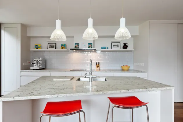 Kitchen 3.33m x 6.91m The kitchen boasts the extensive range of fitted wall and base Darren Langrell units with stone countertops by Millers to include integrated fridge, double oven, hob with extractor fan and tiled splashback. A large central island with breakfast bar includes integrated dishwasher and freezer, stainless steel sink unit with mixer tap. A door from kitchen area opens out to rear garden. A large walk in pantry press provides excellent storage.