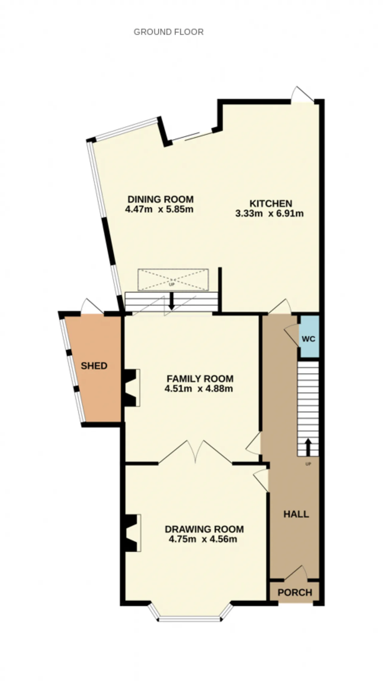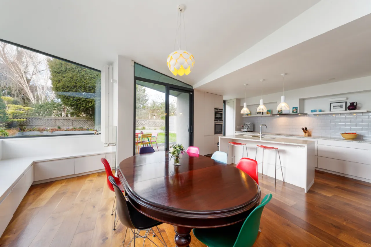 Dining Room 4.47m x 5.85m Fabulous extended open plan room with wideplank wooden flooring and feature corner window with window seating and under-storage. There is large fitted drinks cabinet where the original doors from the dining room have been re-purposed. A substantial skylight allows for a wonderful flow of natural light. Sliding doors open out into the rear garden.