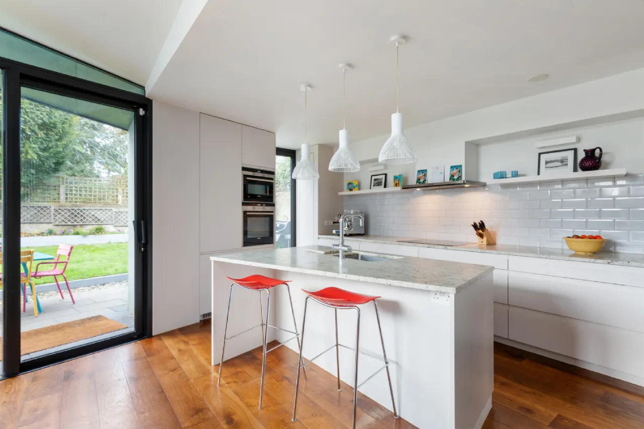 To the rear you will find a light filled and open plan kitchen / dining area - the bespoke Darren Langrell kitchen and island being a real feature and centre piece. Located off the kitchen is a functional utility press and a separate Guest WC. The kitchen and dining area are bathed in natural light which floods in via a large roof light with the dining area featuring a fitted drinks cabinet and interconnecting with the cosy family room via hardwood timber steps. Upstairs does not disappoint, the layout is versatile and perfectly suited to family living with 4 bedrooms and 2 generous bathrooms. Bedrooms 1 & 2 boast bespoke fitted wardrobes, and the main bathroom is generous in size with ample storage. There is a well appointed office area in the landing, perfect for those who work from home.