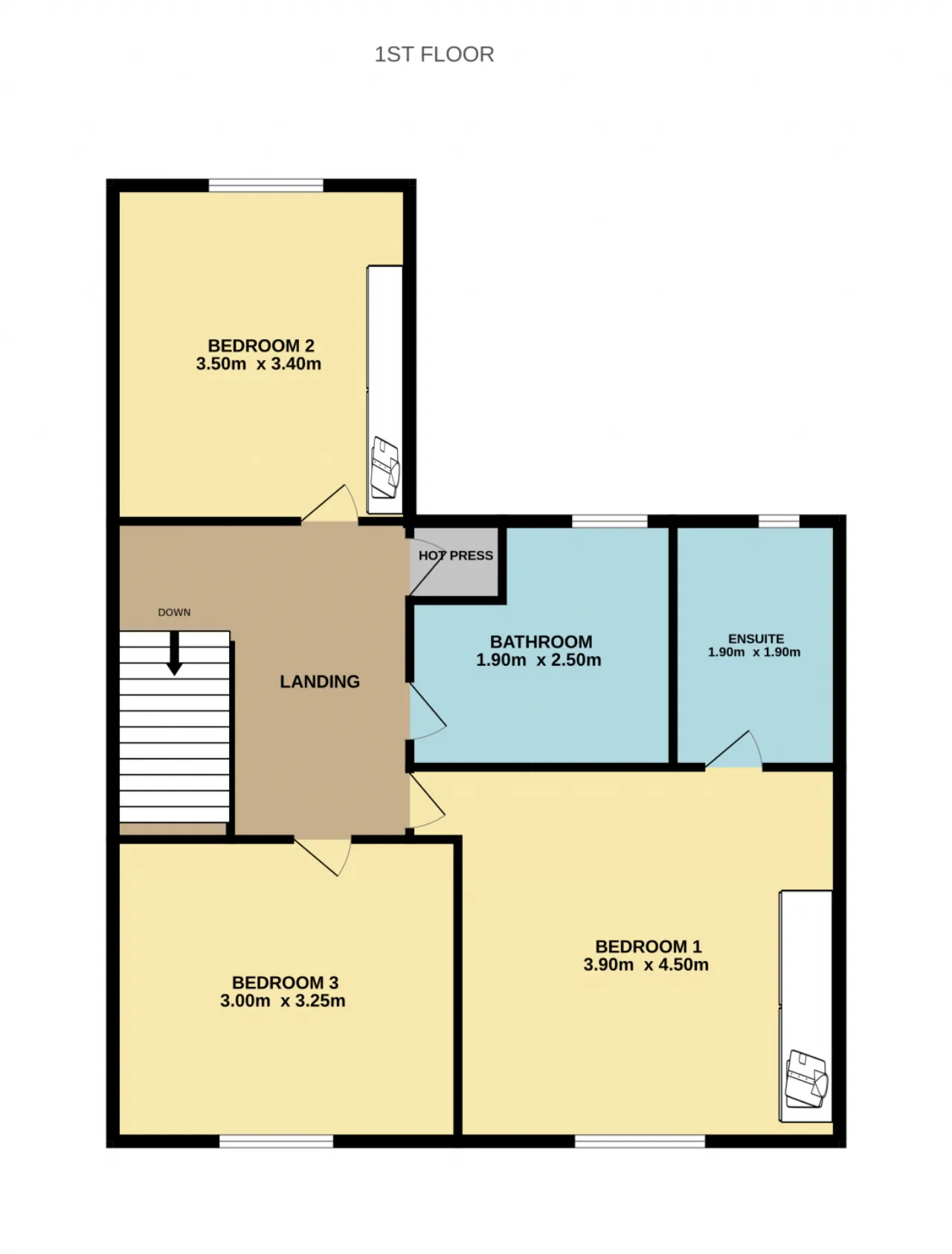 En-Suite Tiled floor and partially tiled walls, WC, wash hand basin, window with privacy glass screen, Triton T90sr shower.