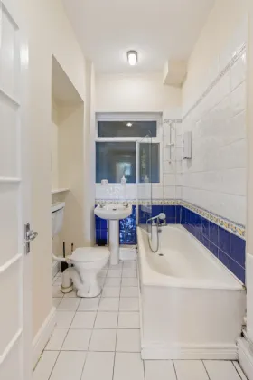 Bathroom Tiled floor, bath, WC, wash hand basin, window with privacy glass
