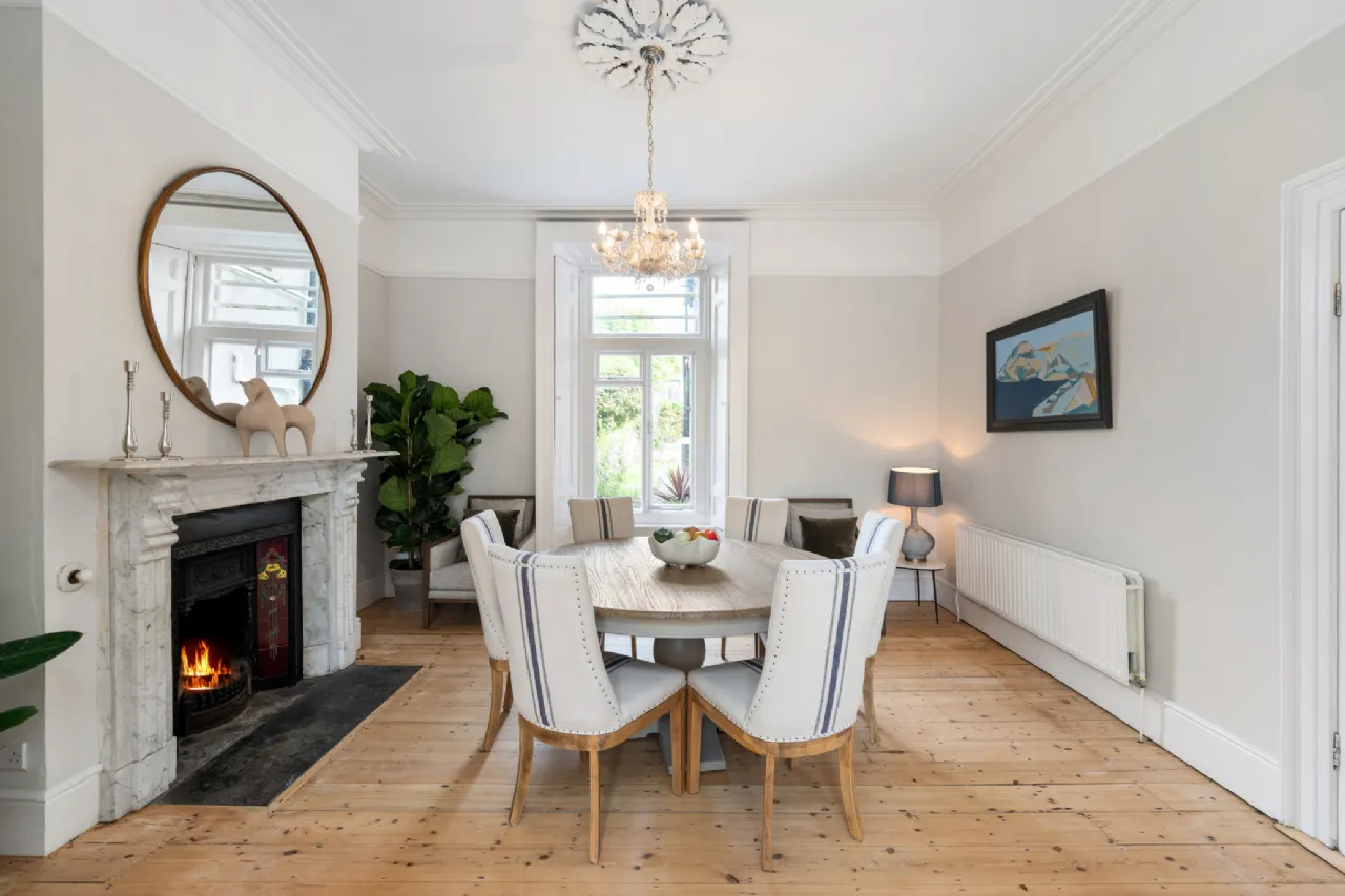 Dining Room: another beautifully proportioned reception room with a stunning matching marble fireplace with cast iron and tiled inset, ceiling cornice, centre rose, picture rail, original window shutters and polished timber floor.