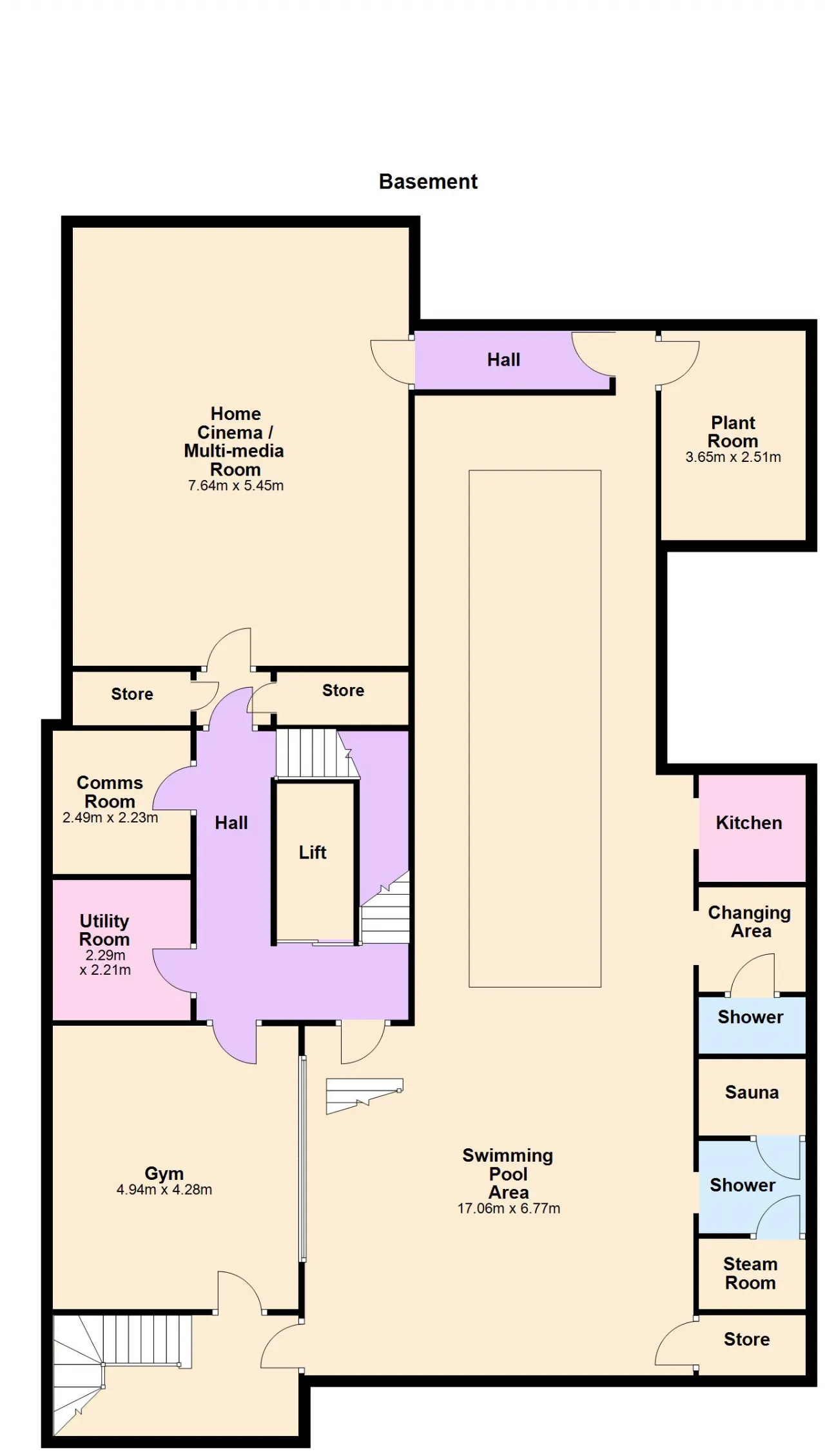 Swimming Pool area 14m heated pool with 1.3m depth (flush) illuminated by dramatic mood lighting in soft colours, poolside lounge area with Italian porcelain tiled floor and part tiled walls. Access to sauna, steam room, shower areas, guest WC, changing area, kitchenette, plant room for pool.