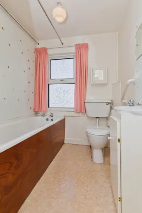 Family Bathroom 2.20m x 1.77m Opaque window to rear aspect, deep fill bath with shower above, WC, wash hand basin with mixer tap and lino flooring.