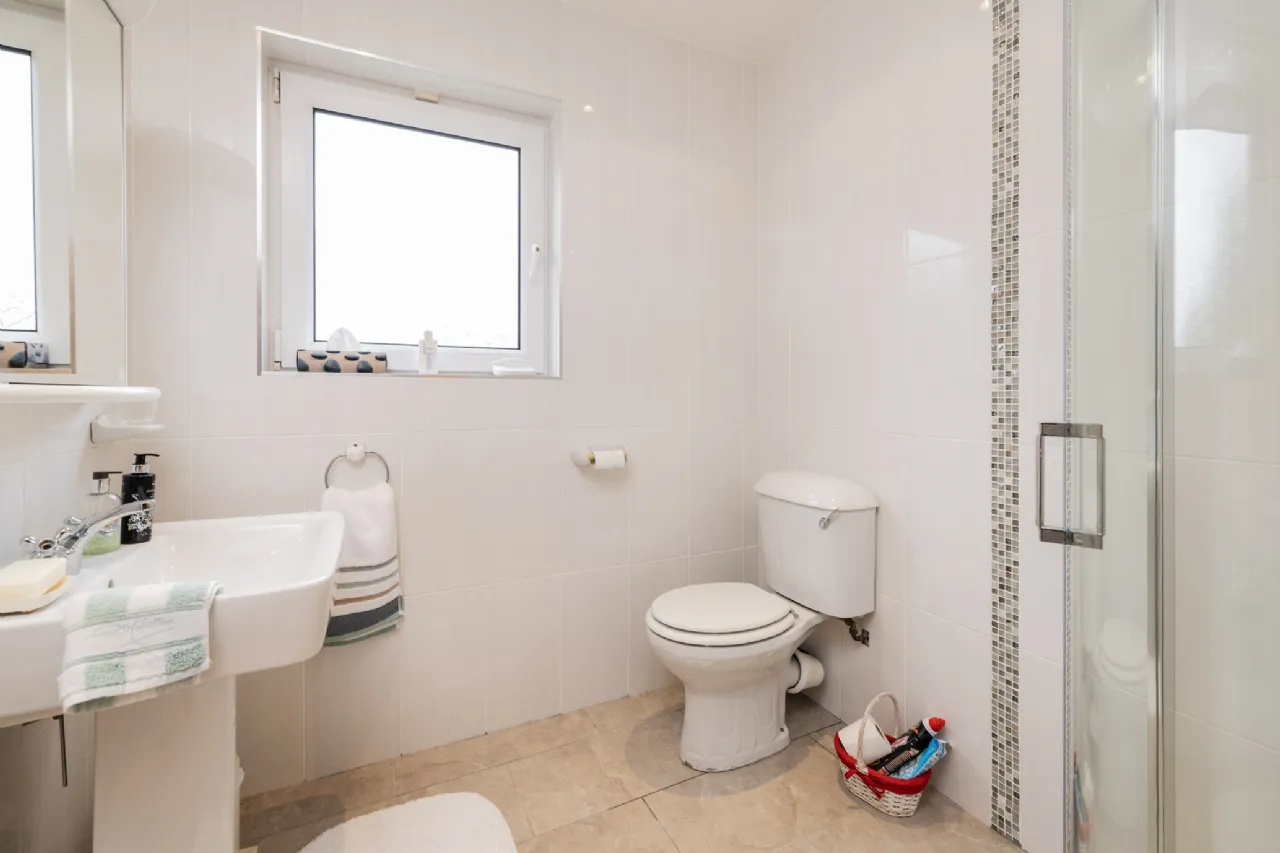 Family Bathroom 1.97m x 2.44m Tiled floor to ceiling, W.C, W.H.B., & shower unit with electric shower.