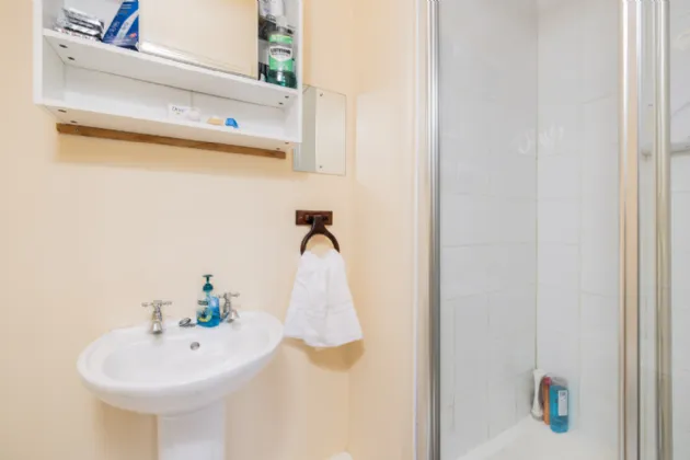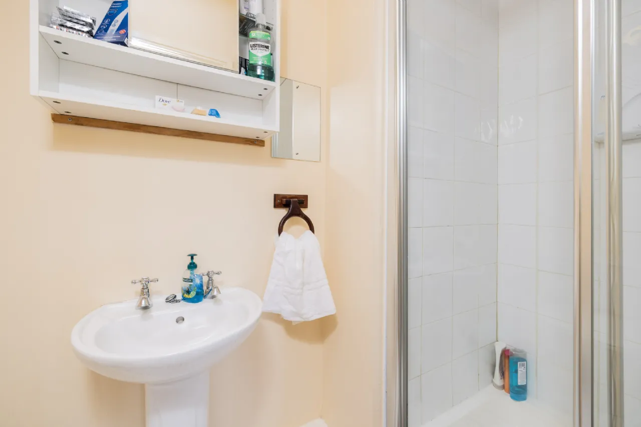 En-Suite 2.61m x 1.18m With tiled flooring, w.c., w.h.b., and shower unit.