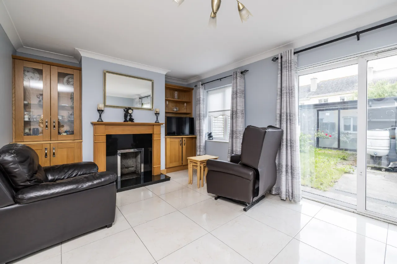 Living Room/ Dining Area 8.57m x 5.14m Bright and spacious living/ dining area with tiled flooring, coving to ceiling, feature fireplace, build in display and storage cabinets, sliding doors to rear garden.