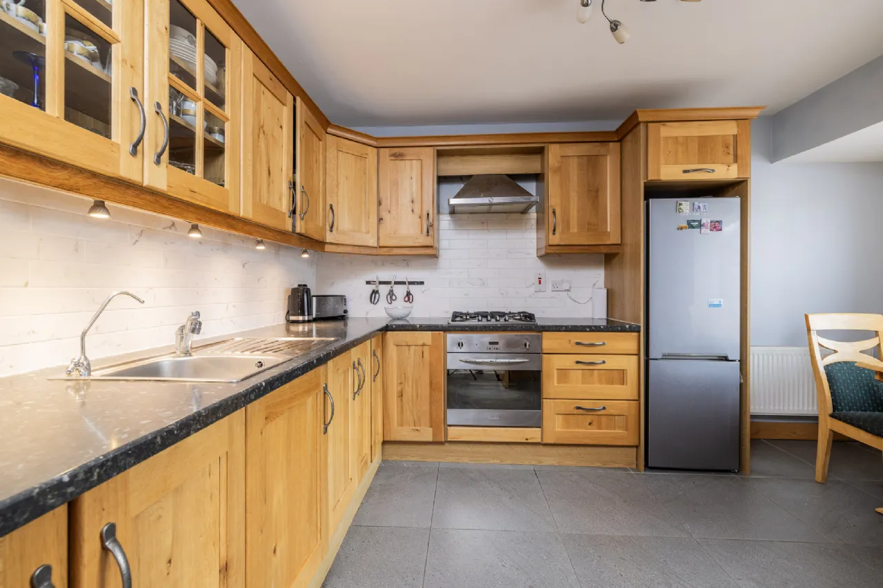 Kitchen 3.29m x 4.58m With tiled flooring, fully fitted kitchen with plenty of floor and wall mounted units, tiled splash back, built in oven, hob & extractor fan, and space for fridge freezer.