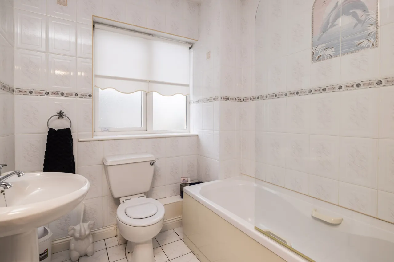 Bathroom 1.86m x 2.11m Fully tiled floor to ceiling with w.c., w.h.b, bath with shower over.