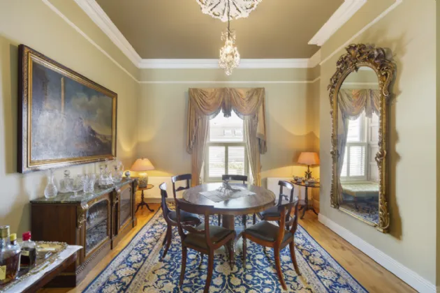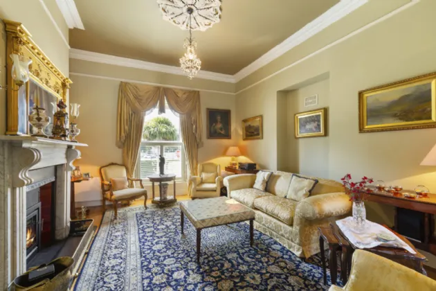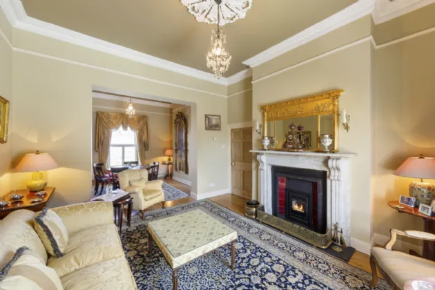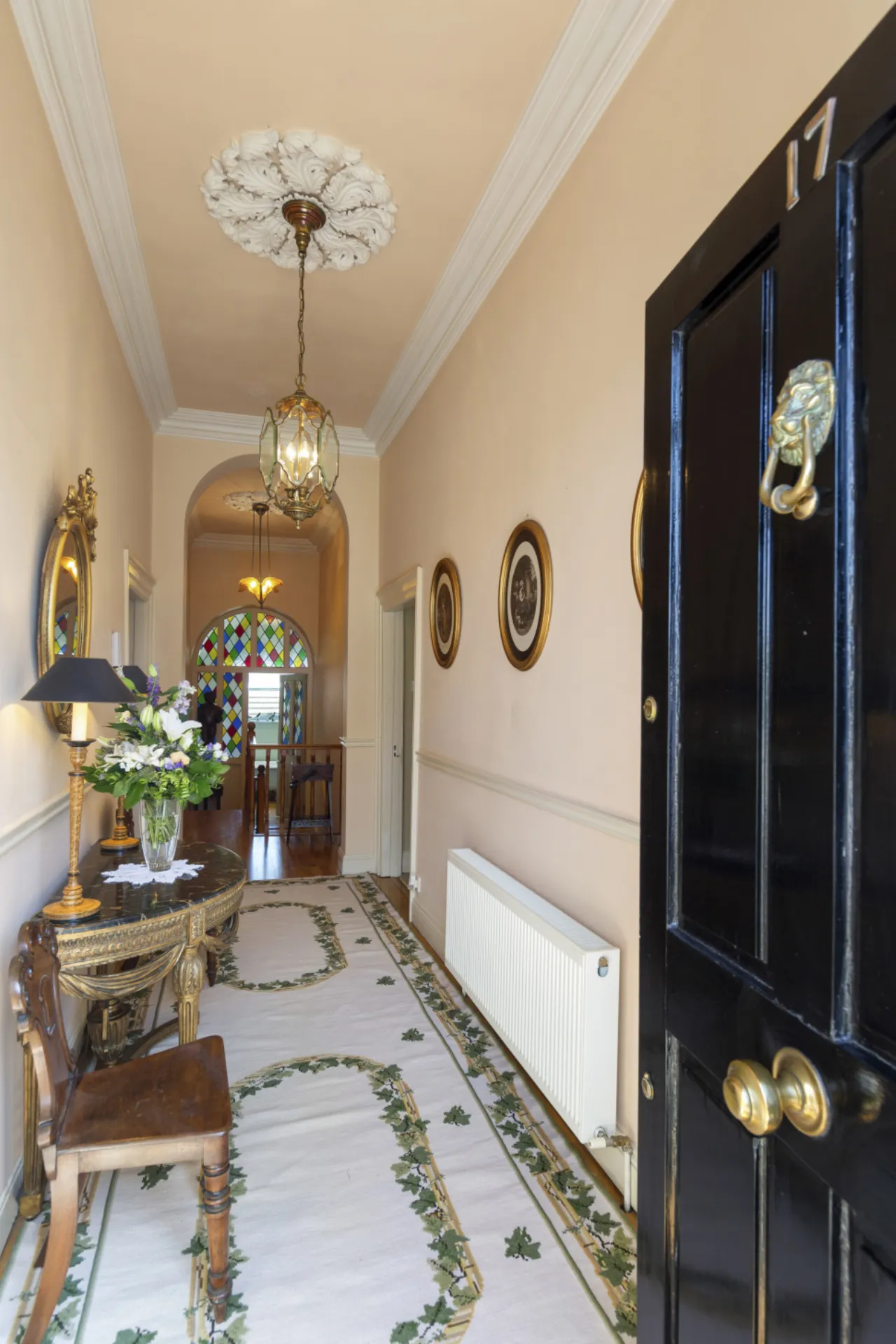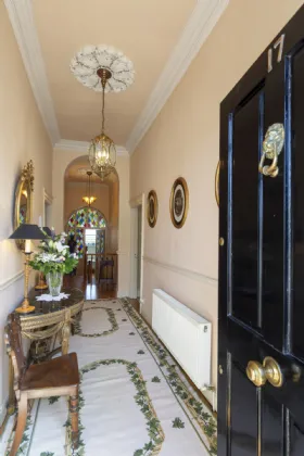 A flight of granite steps flanked by wrought iron railings, ascend to the front door with overhead fanlight and side lights. The wide entrance hall with period detail to include ceiling coving, centre rose and archway leading to the rear hall sets the tone for what lies ahead. To the left are well proportioned interconnecting reception rooms with tall ceilings, these gracious and elegant reception rooms are ideal for formal entertainment. On the right of the entrance hall is a sitting room which could just as easily be used as a second bedroom. Also to the right of the hall is the third bedroom overlooking the rear garden. Stairs descend to the rear return where the large family bathroom is located a stunning stained-glass door with fanlight over is not only a pretty feature but also allows for natural light to permeate the entry ways.