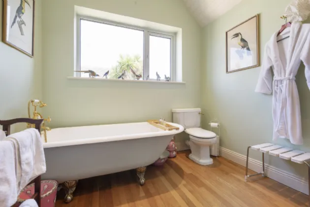 Bath/Shower Room 2.73m x 2.63m Overlooking the rear garden, cast iron slipper bath with mixer tap and shower attachment, pedestal wash hand basin, separate shower cubicle, WC, polished timber floor.