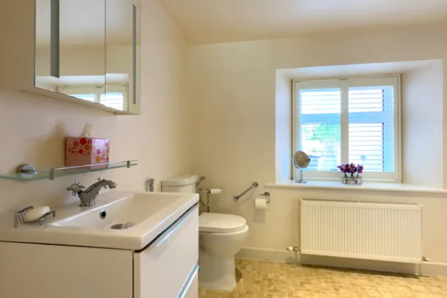 EnSuite/Shower Room 3.71m x 4.13m Tiled floor, wash hand basin and inset in vanity unit with mirrored vanity cabinet and shelf over.