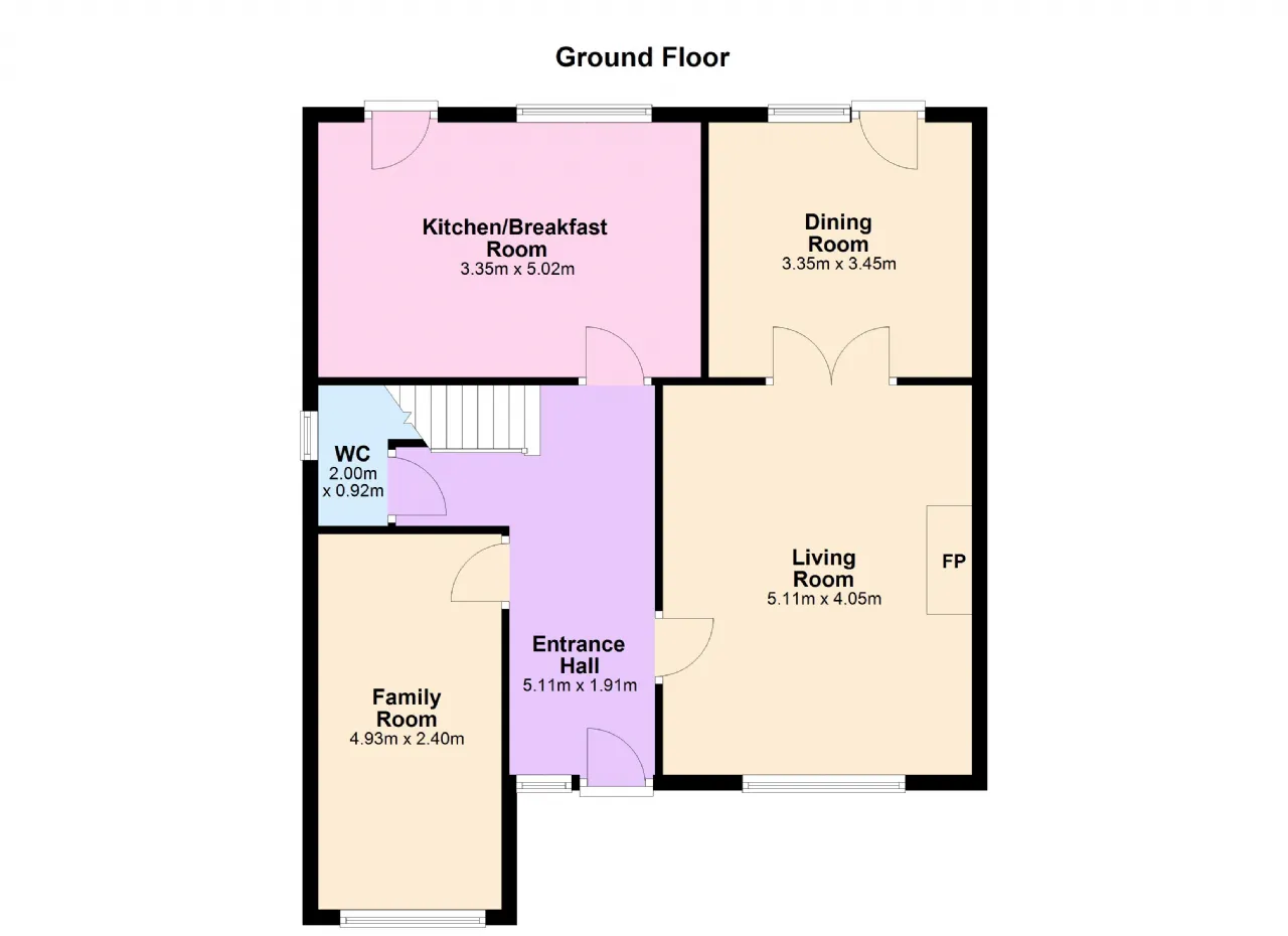 Family Room 4.93m x 2.40m Carpeted. Window overlooks the front.