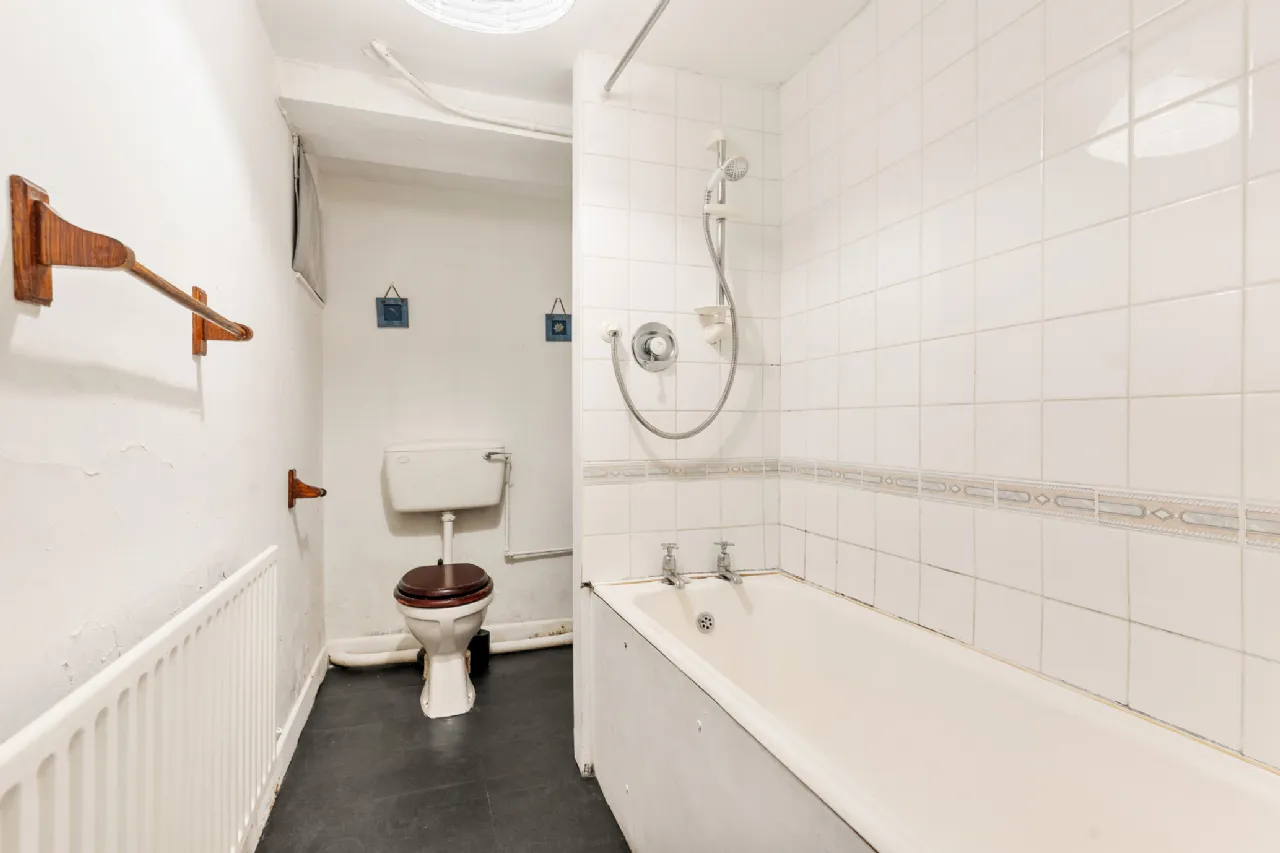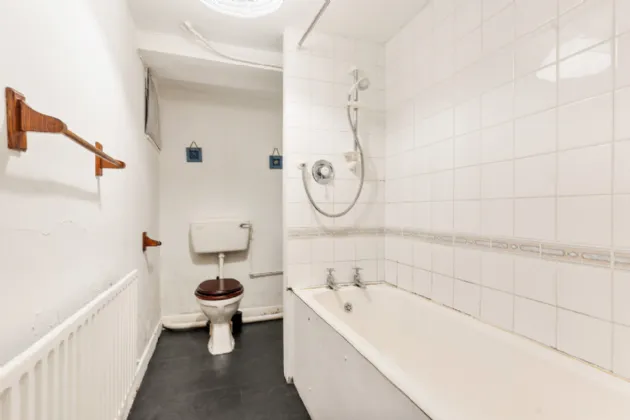 Bathroom with tiled floor, partly tiled walls, bath with shower attachment, wash hand basin and w.c.