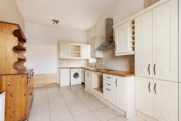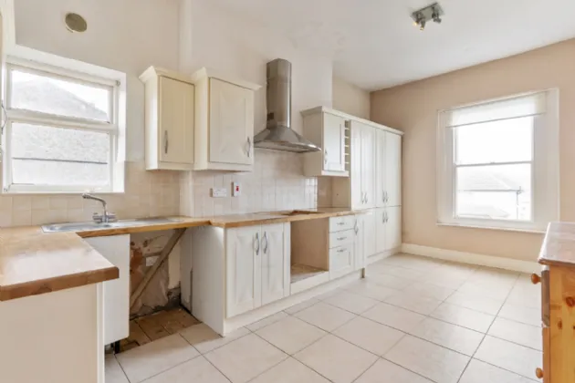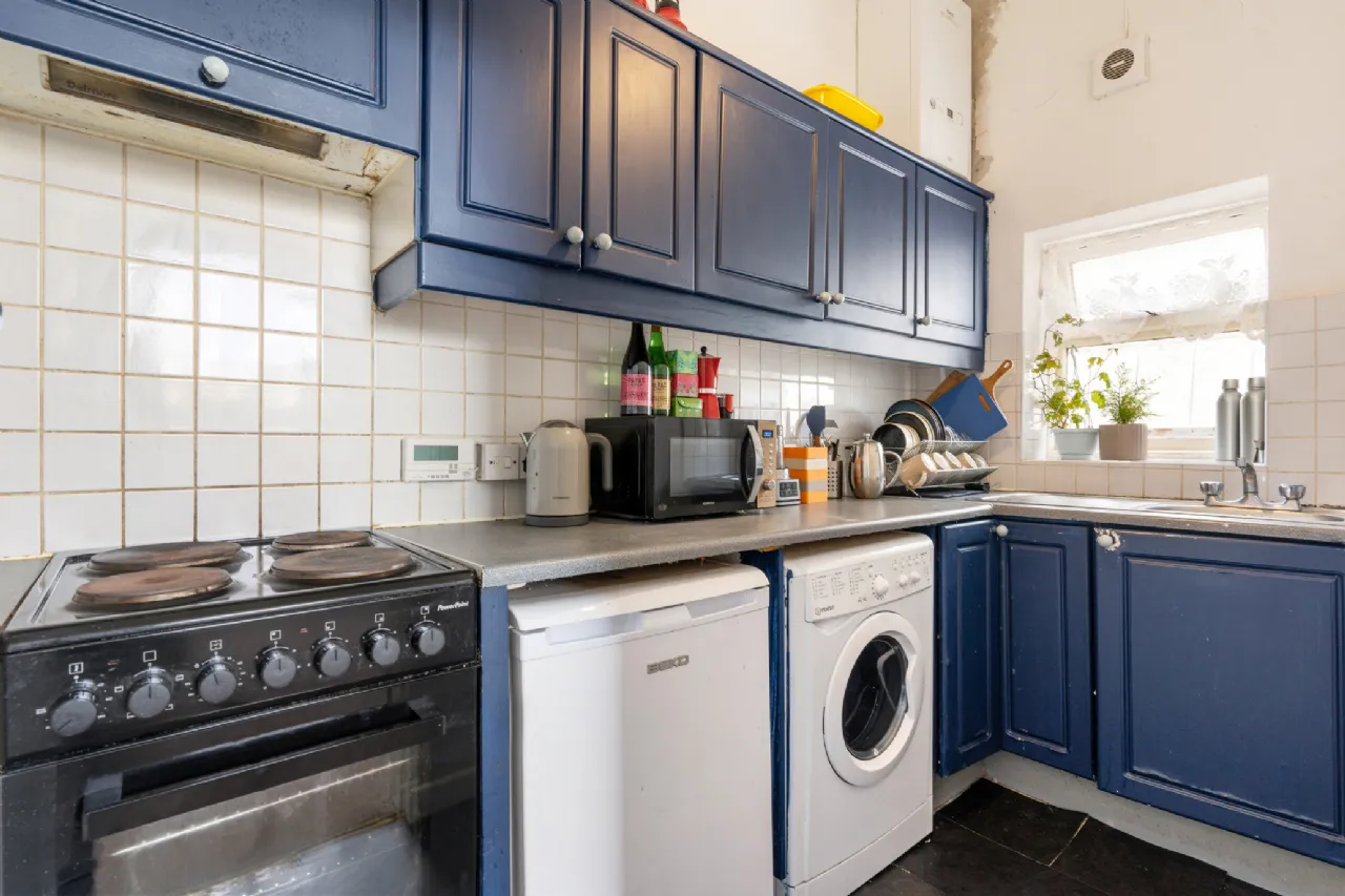 Kitchen with a range of fitted units, tiled floor, Hotpoint washer/dryer, extractor fan, stainless steel sink, gas boiler and sash windows overlooking the front and side.