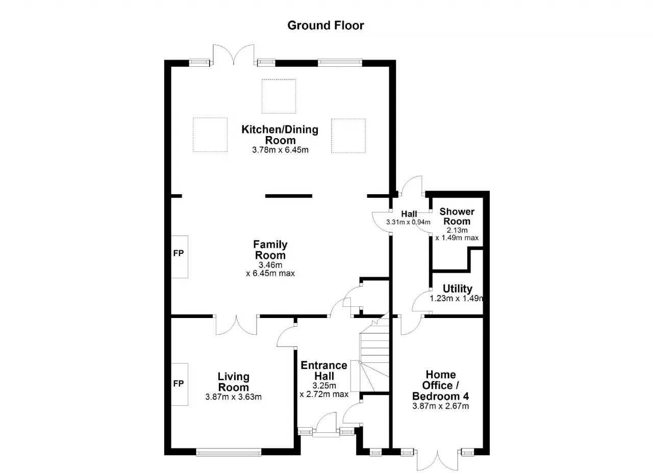 Home Office/ Bedroom 4 3.87m x 2.67m Lovely bright room with laminate floor and double doors to the front garden. Currently in use as a home office but could be used as a bedroom or play room.