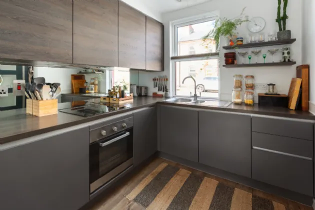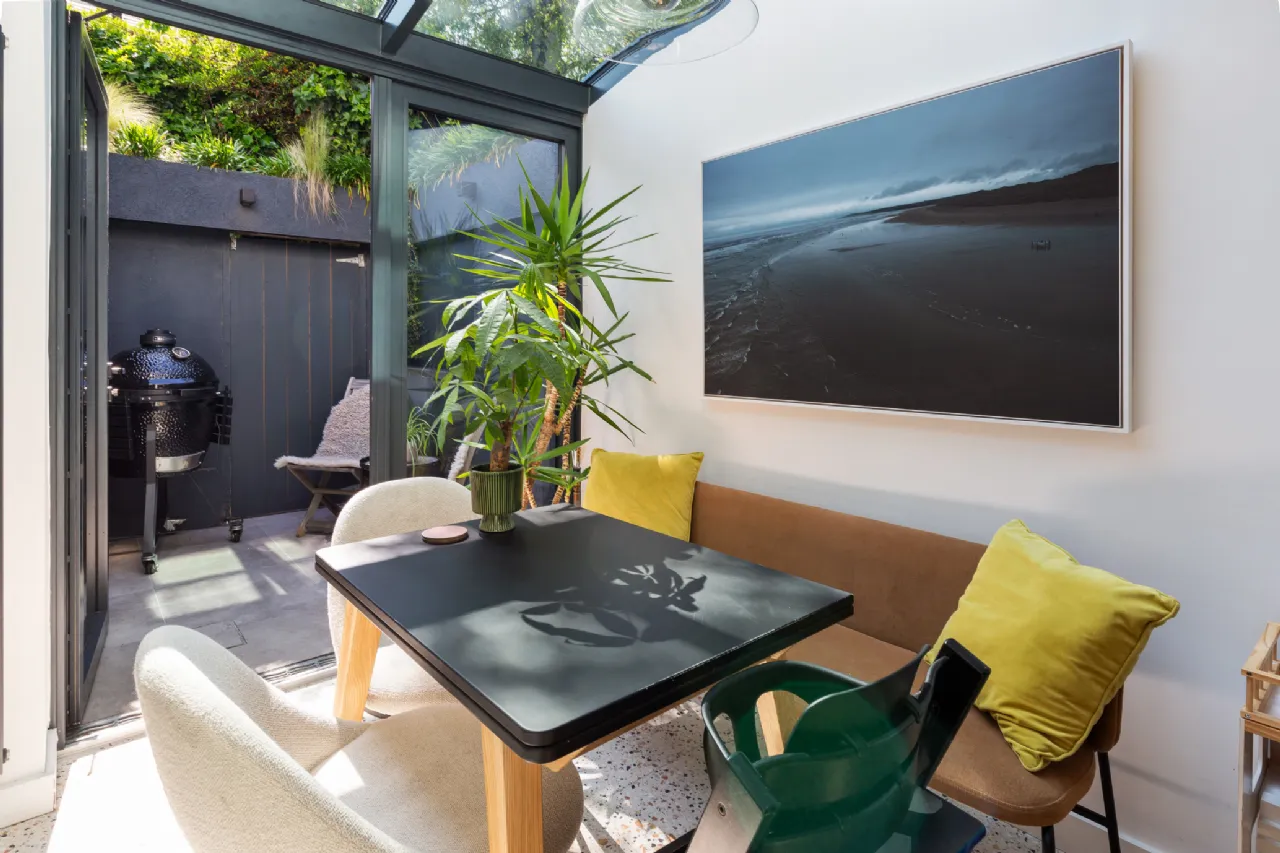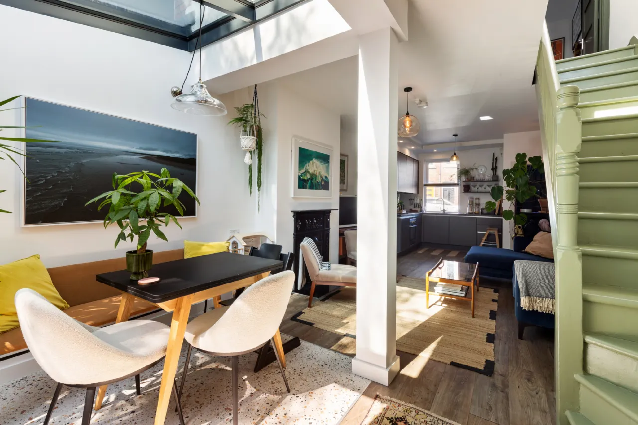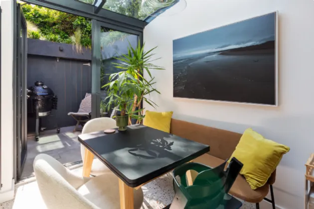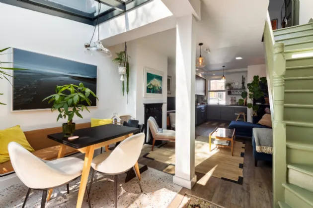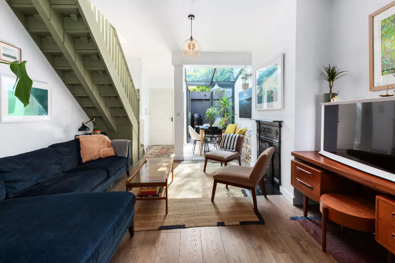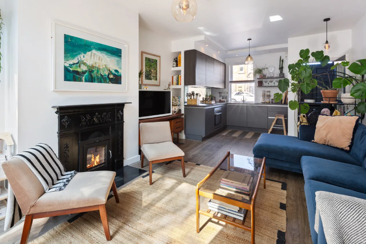 Kitchen/Living/Dining Area 8.5m x 4m A beautiful open plan space stretching the full length and width of the house, combining functionality with charm. The kitchen is fully fitted with a built-in oven, hob, extractor fan, integrated dishwasher, and fridge. The living area features an inset fire with a striking ornate cast-iron surround, while the dining area, with tiled flooring, overlooks the rear courtyard—an ideal setting for everyday living and entertaining.