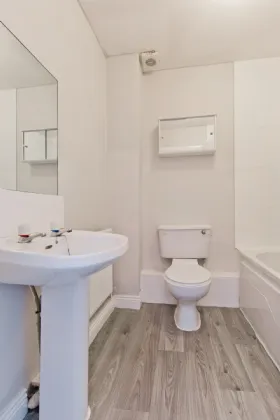 Bathroom 1.9m x 1.8m Comprising bath with shower off, Wc, wash hand basin, fully tiled walls and flooring.