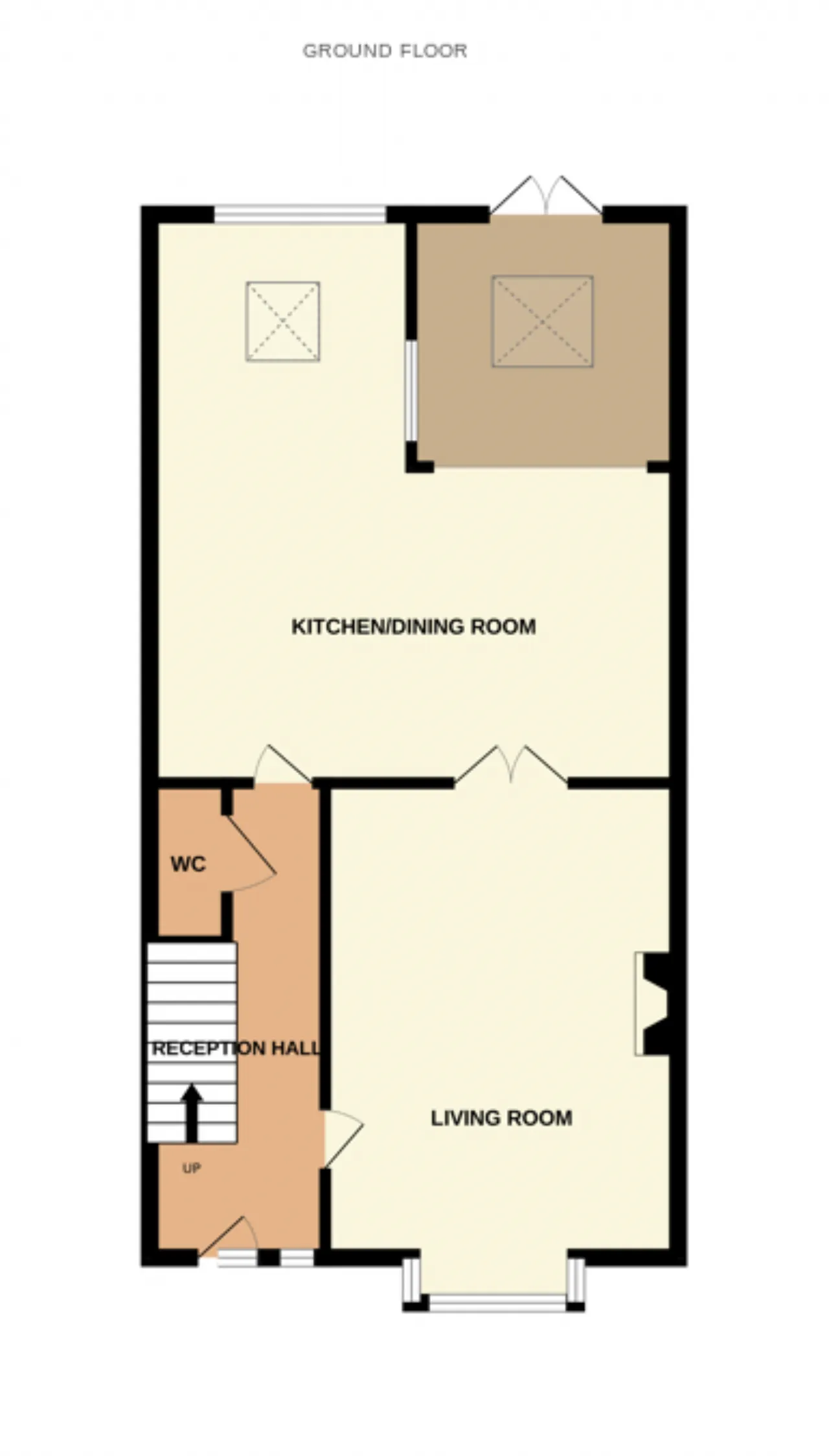 Kitchen/Dining Room 5.5m x 6.9m Excellent open-plan kitchen/dining room with feature exposed internal red brick wall, tiled flooring, and double patio doors opening to a private rear garden. A breakfast counter with red brick pod leads to a solid wood kitchen with ample wall and floor units, quality worktops, dishwasher, fridge/freezer, and extractor fan. Velux roof light provides additional natural light over the kitchen area.
