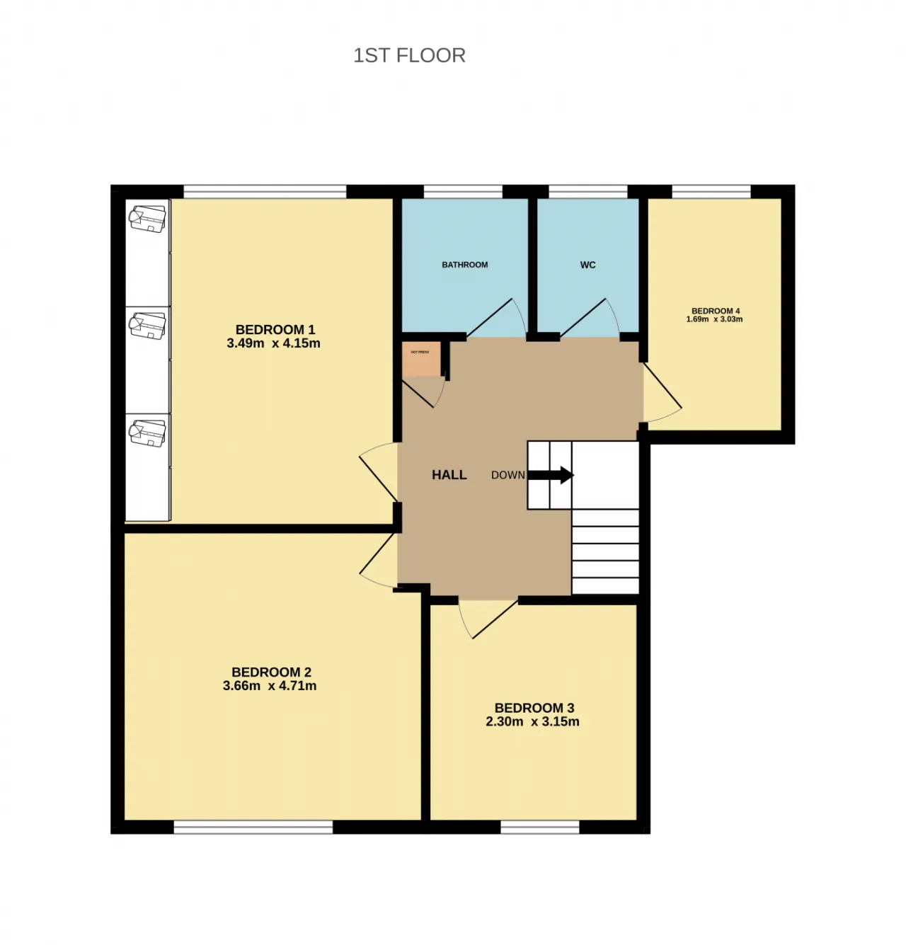 Bedroom 4 1.69m x 3.03m A single bedroom, also suitable for use as a home office.
