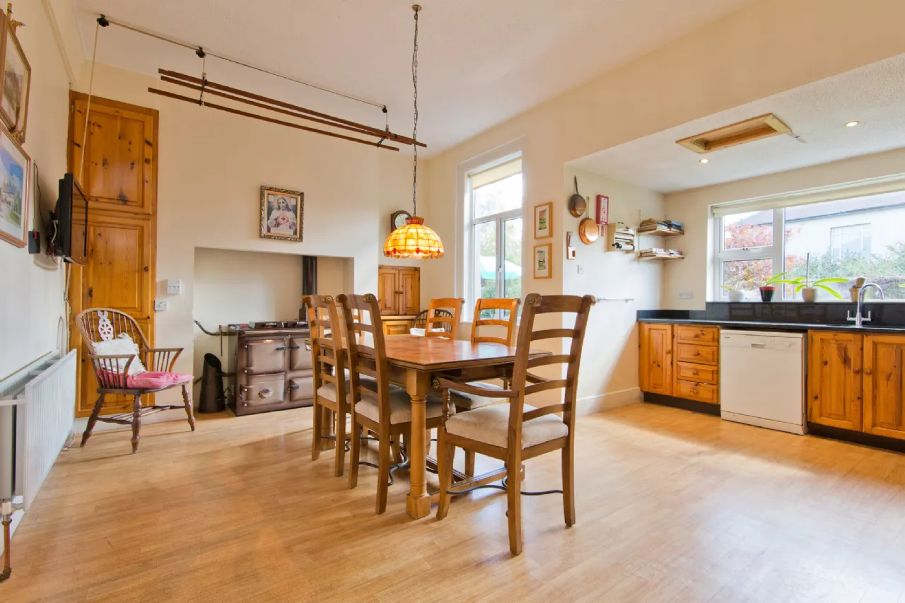 Kitchen/Breakfast Room 5.37m x 5.43m Wall and floor units, fitted cabinets, recessed lighting, Rayburn range, stainless steel sink, Mule dishwasher, Zanussi oven and hob, and Belling fridge freezer.