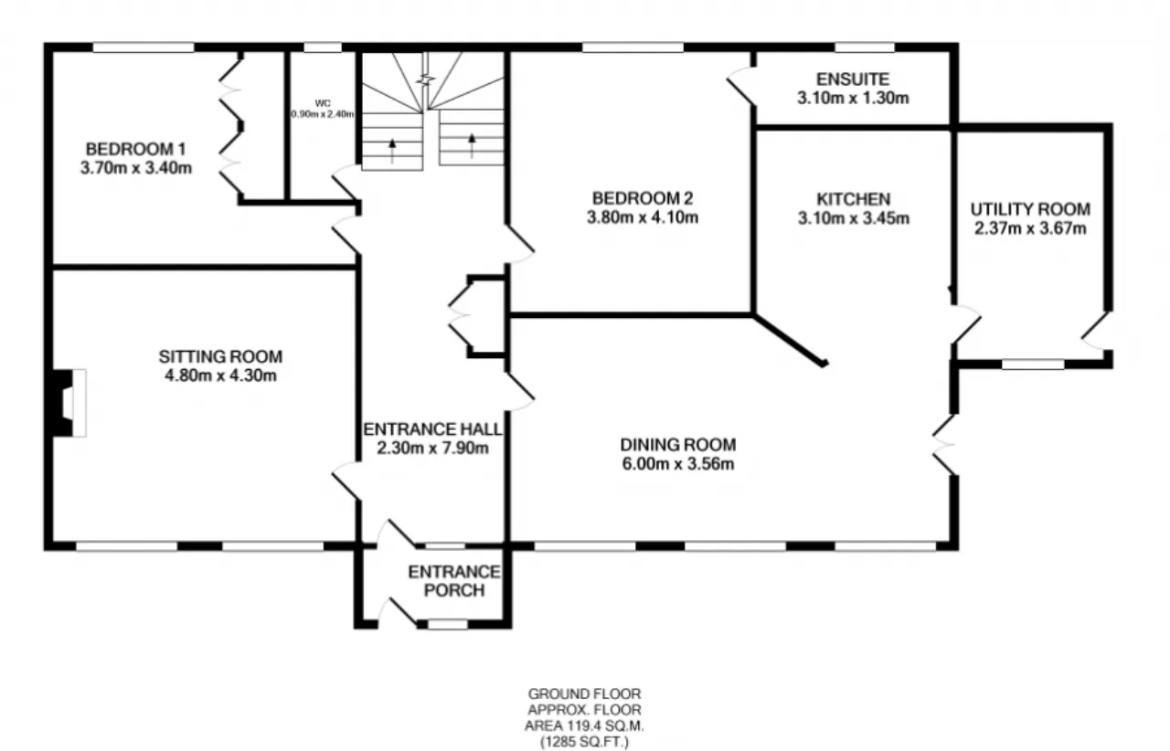 Sitting Room Beech solid timber floor, fireplace with natural limestone surround 6 kilowatt solid fuel inset stove.