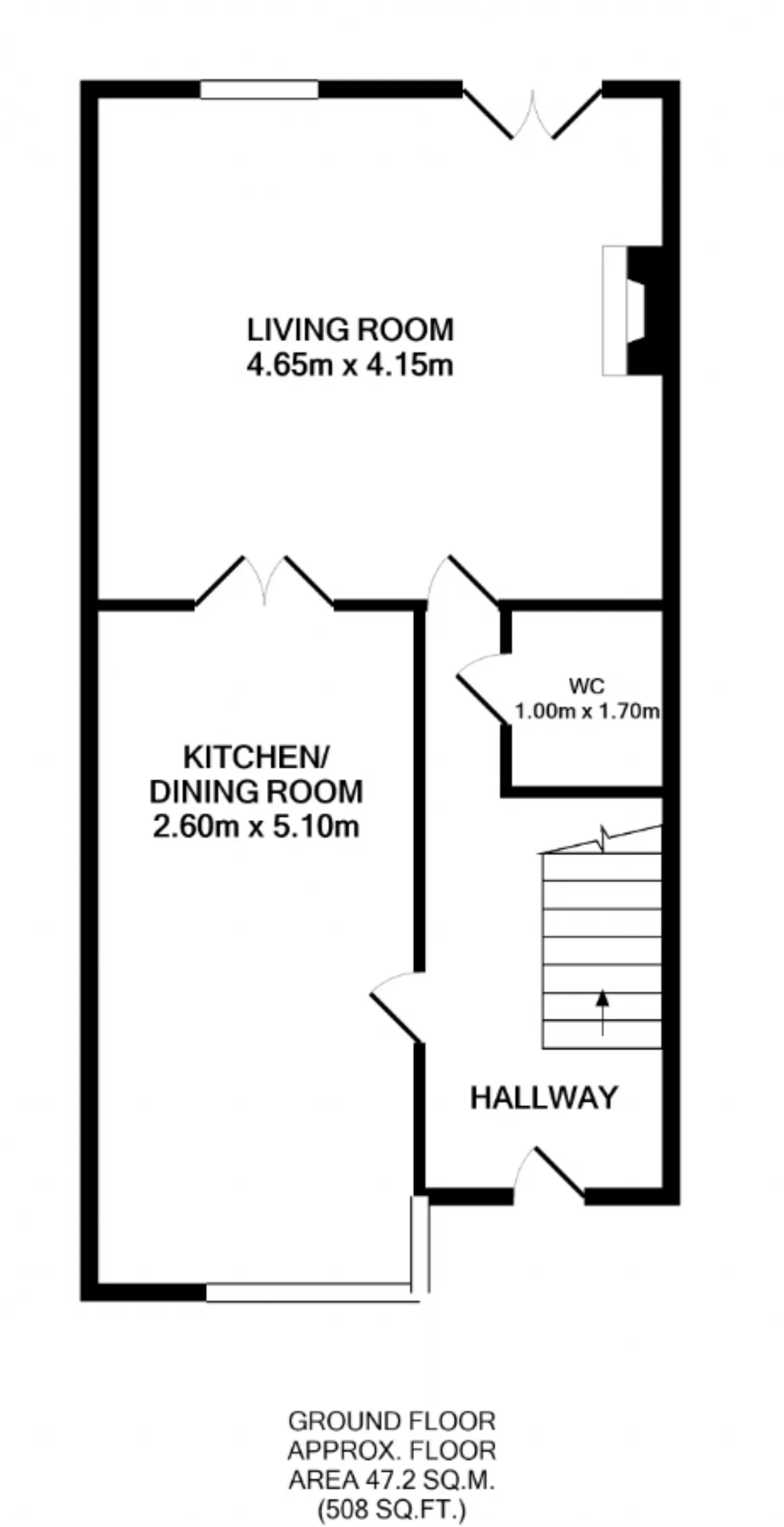 Living Room Laminate floor, open fire with granite hearth, double doors to rear garden & patio area, coving & tv point.