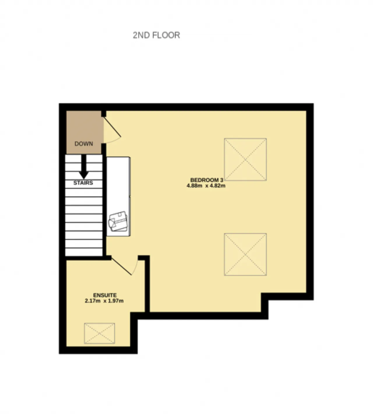 Bedroom 3: Spacious twin room with laminate wooden floor, two large velux windows, fitted wardrobes and study area, access to attic space.