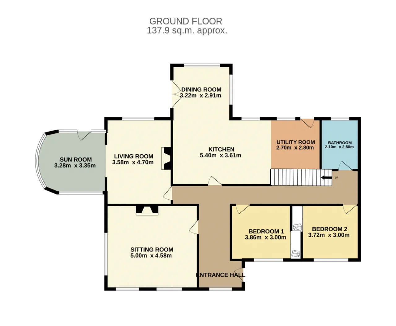 On the ground floor, a bright and welcoming entrance hall leads to a spacious sitting room, perfect for entertaining or relaxing. A separate living room opens onto a light-filled sunroom with direct access to the private rear garden; an ideal spot for year-round enjoyment. The large open-plan kitchen and dining area is beautifully arranged, overlooking the garden to the rear and side. Additional ground-floor accommodation includes a utility room, two double bedrooms, and a well-appointed bathroom. Upstairs, there are three generous double bedrooms. The main bedroom features a stylish, modern ensuite, while a spacious family bathroom serves the remaining rooms.
