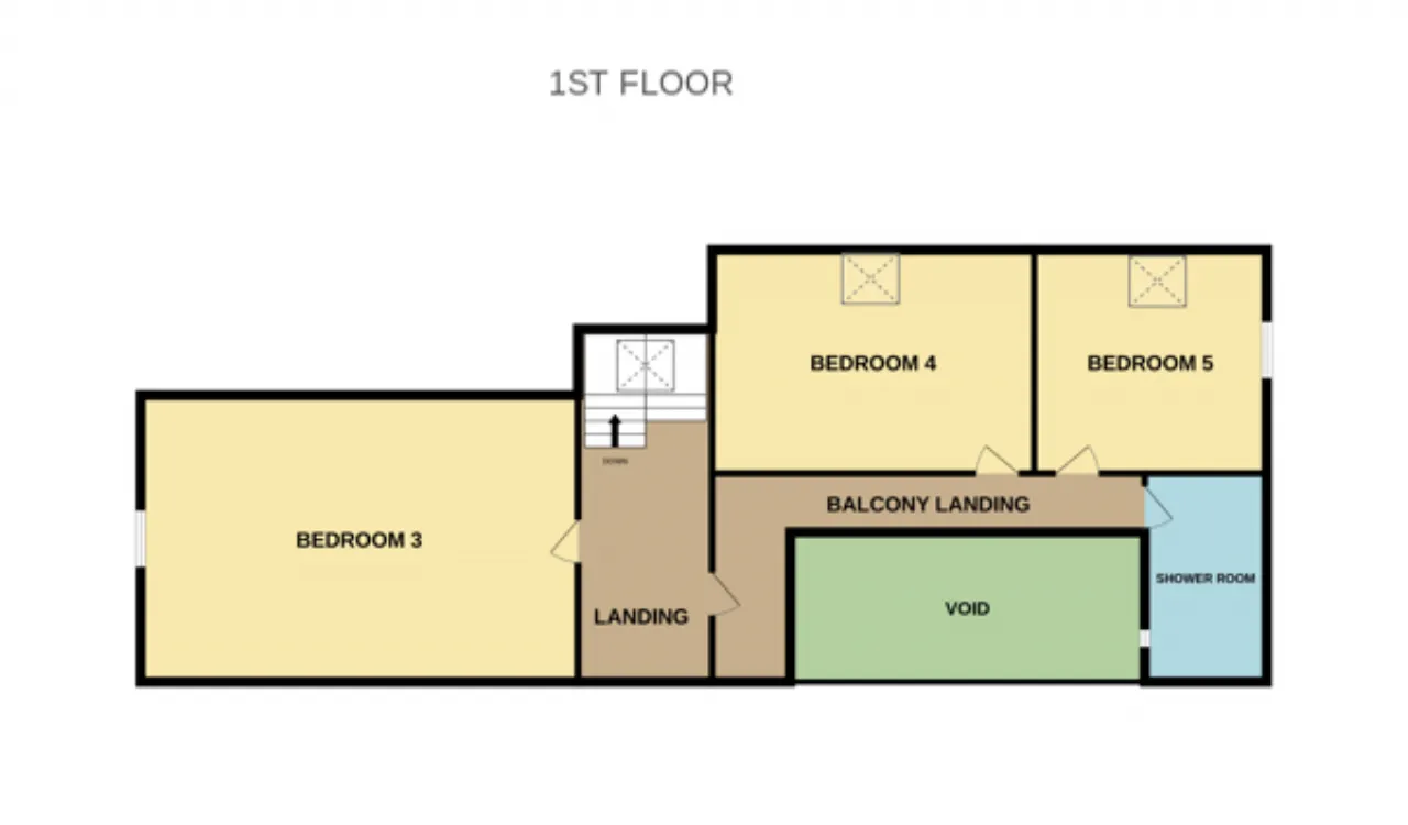 Landing: Laminate timber flooring, Velux window to rear, glazed door to hallway with balcony overlooking kitchen. And access to bedrooms and shower room.