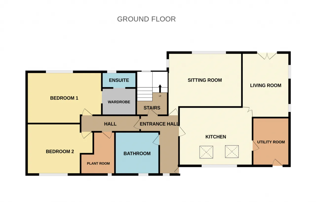 Stepping inside, a welcoming entrance hallway sets the tone for the property, opening into a striking open-plan kitchen and dining area. This impressive space is enhanced by a feature double-height ceiling and an elegant balcony overlooking from the upper level, creating an airy, light-filled environment. From here, double doors flow into the main living room, while a separate sitting room with dual aspect windows offers far-reaching sea views. A rear hallway leads to two well-proportioned ground floor bedrooms, one of which includes an en-suite bathroom and walk-in wardrobe. A large family bathroom and practical utility room complete the ground floor accommodation. The upper level hosts three additional bedrooms, along with a contemporary shower room, making this home perfectly suited to a growing family.