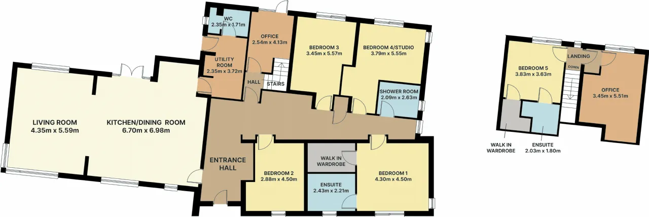 The bright, double height hallway is like a spine running through the ground floor leading off to 4 bedrooms and reaching a floor to ceiling picture window at the end. The main bedroom is very spacious, has an ensuite bathroom and a large walk-in-wardrobe. There is also a shower room, utility room, guest WC and study on the ground floor before you go upstairs for a large home office and an ensuite fifth bedroom.