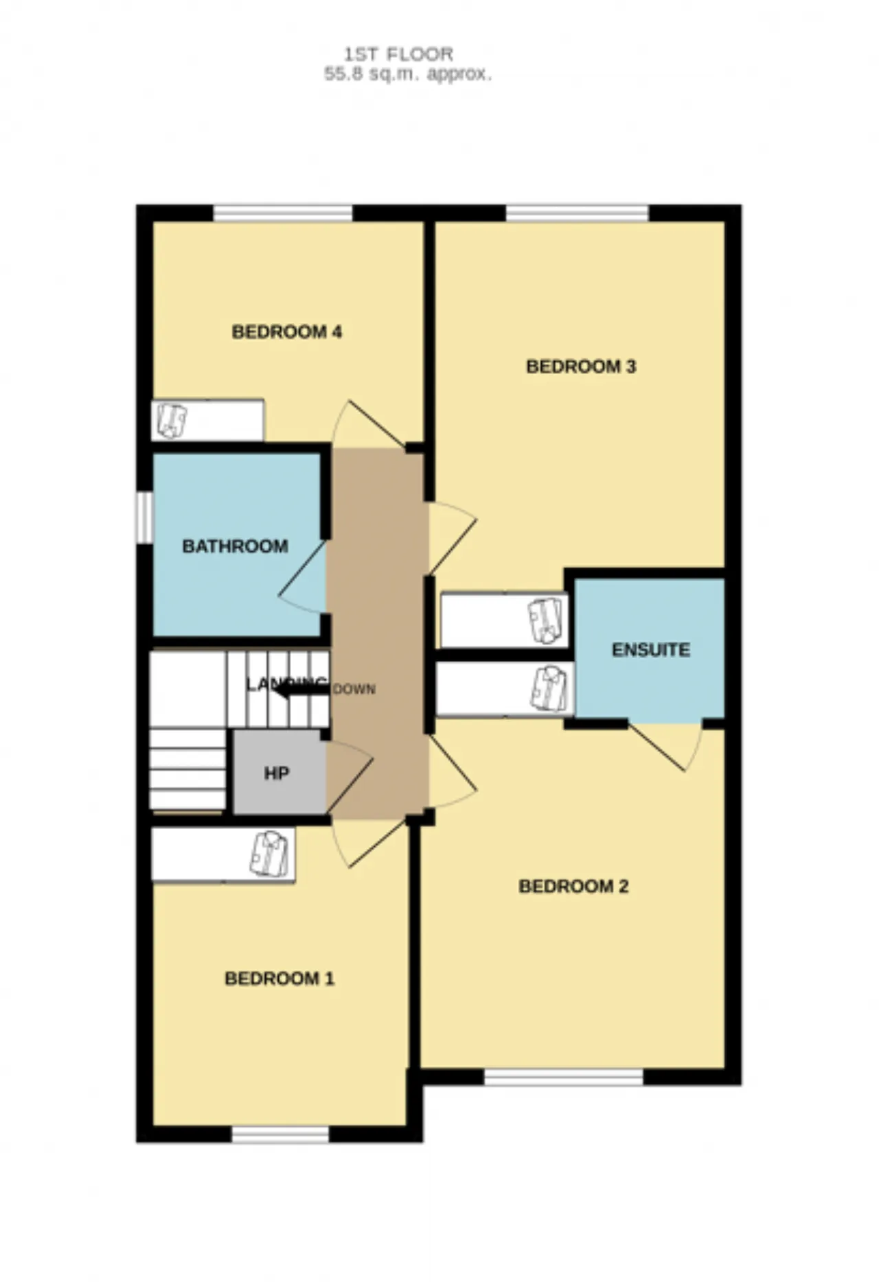 The home is entered through a bright and welcoming hallway which leads to the living room filled with natural light from a large bay window, with double doors leading through to a contemporary open-plan kitchen and dining area. A separate utility room provides additional convenience, while a guest wc positioned beneath the stairs completes the ground floor accommodation. On the first floor there are four well-proportioned bedrooms, one of which benefits from an ensuite bathroom, together with a fully upgraded main shower room.