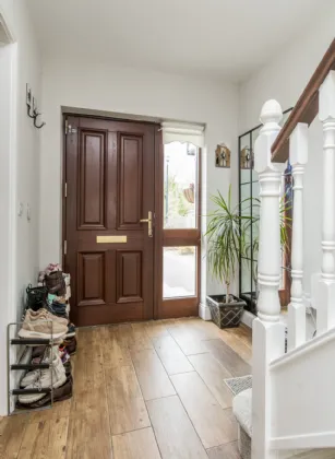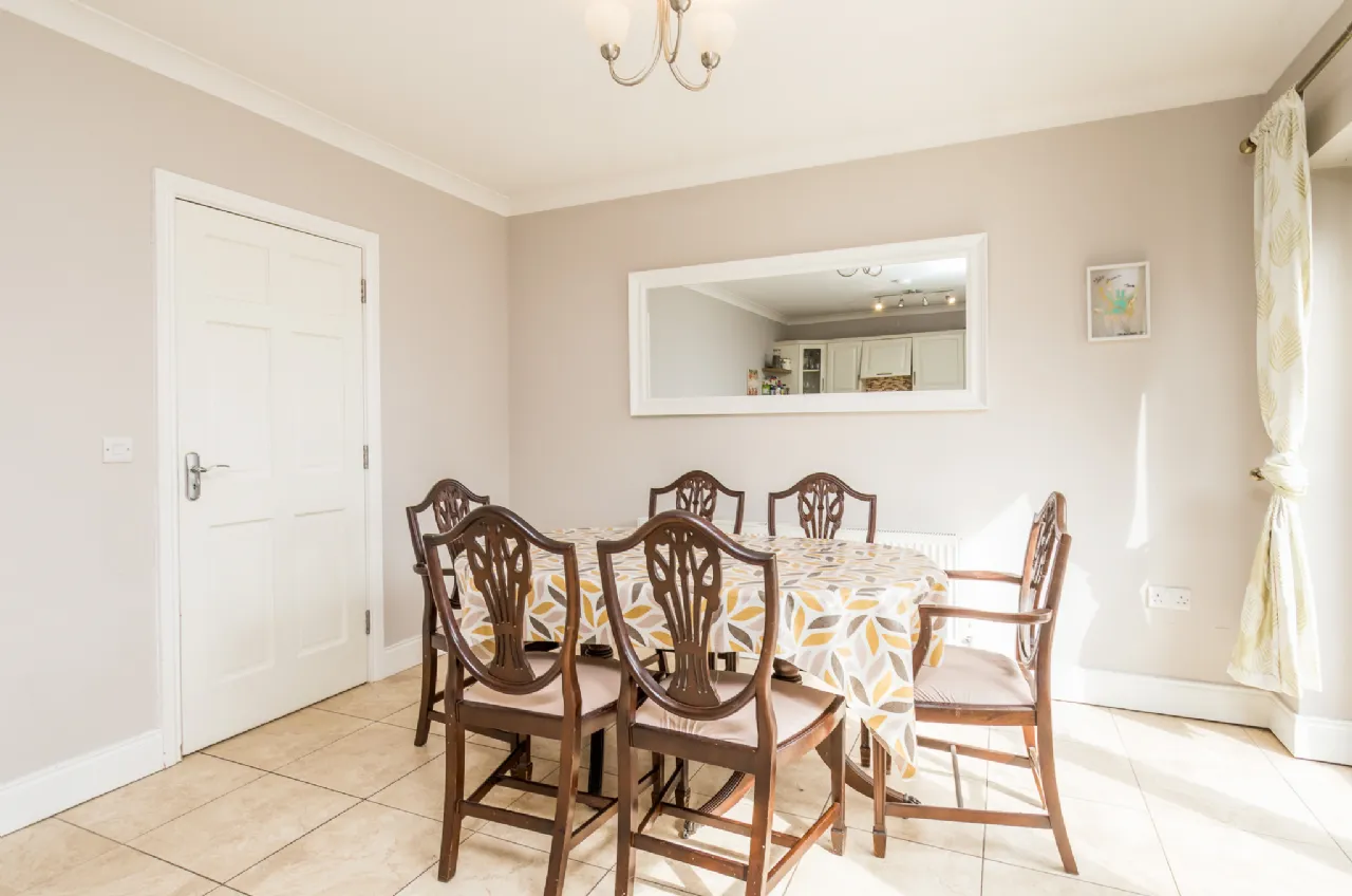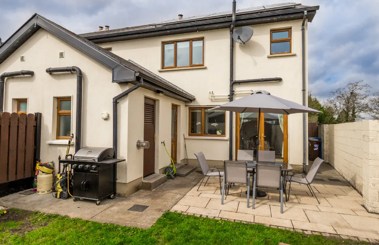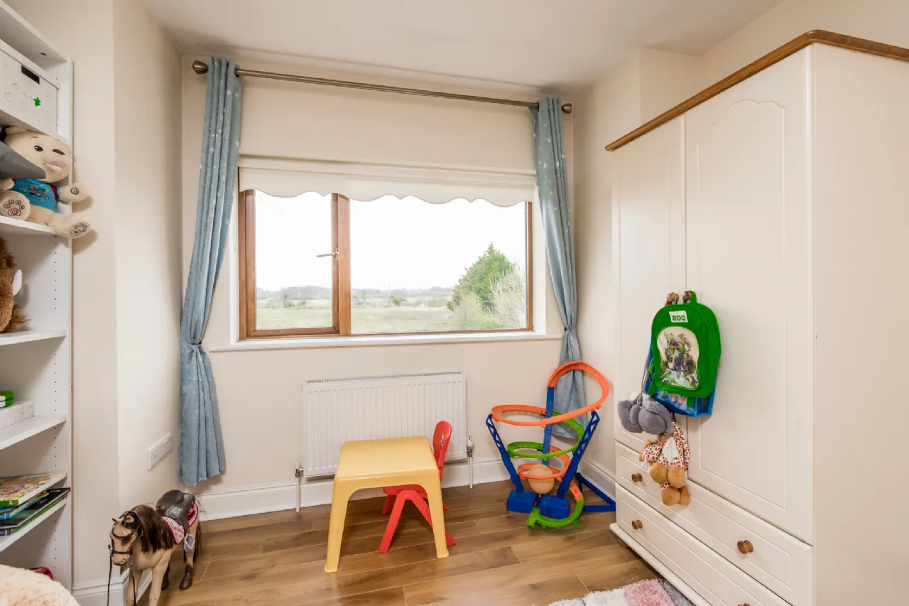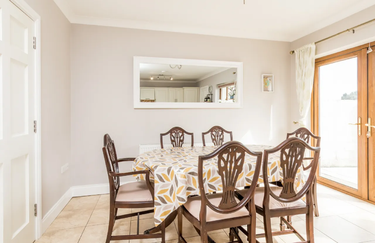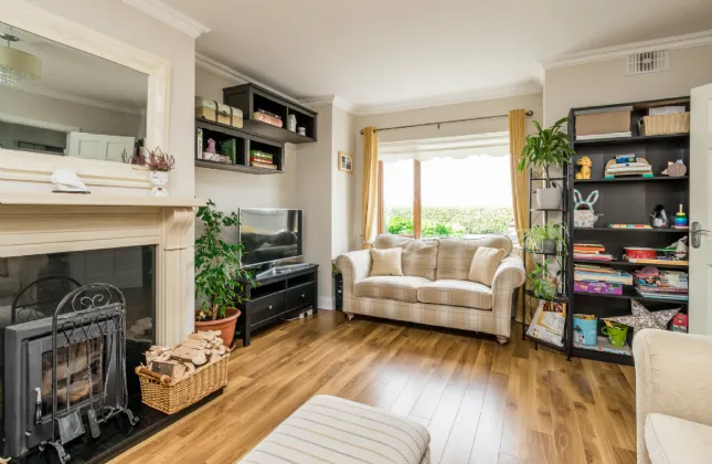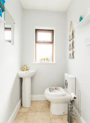 The house benefits from modern PVC windows and doors, oil-fired central heating, and an oil tank situated at the rear of the property. The attic space also offers potential for further improvements. A hot press with an insulated cylinder enhances the home’s energy efficiency.