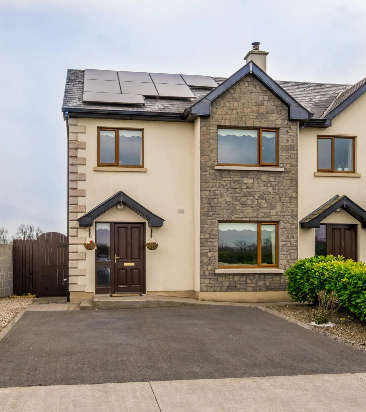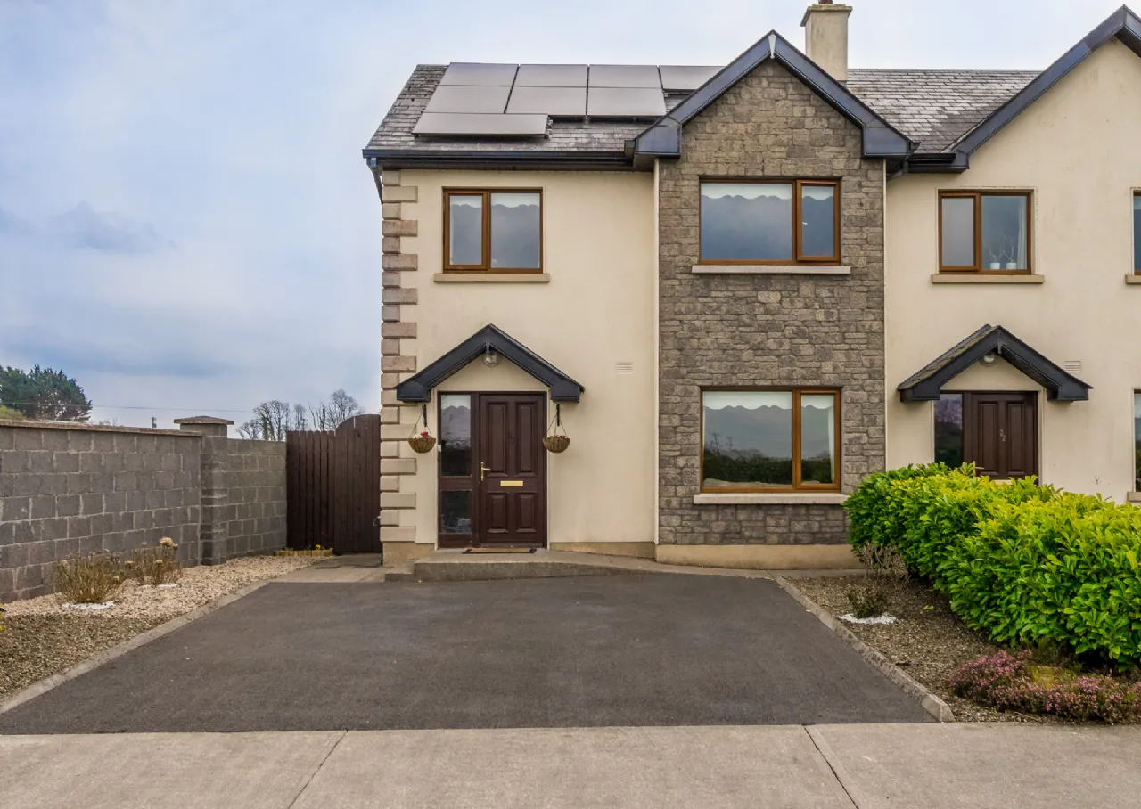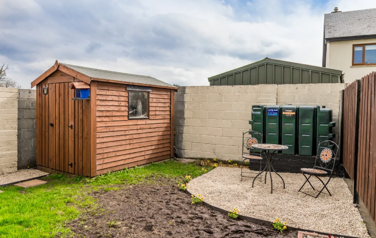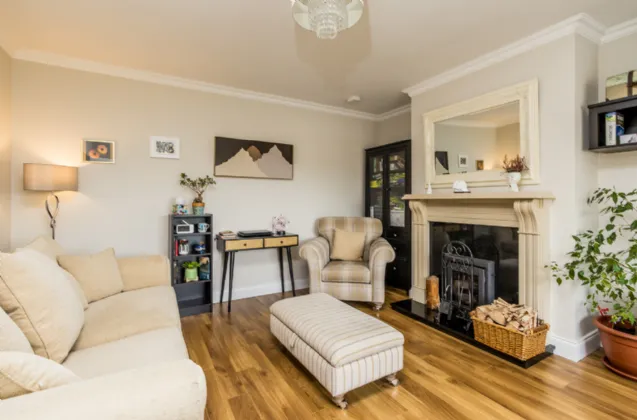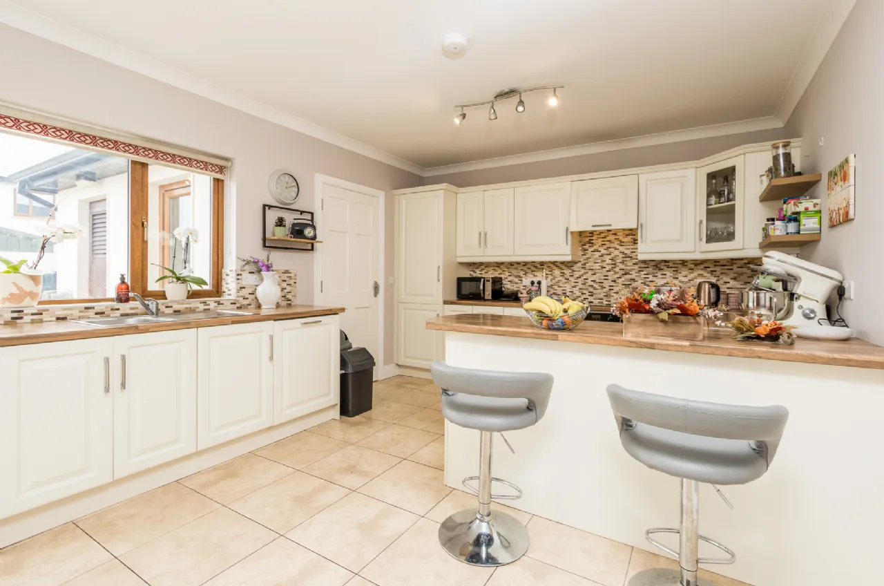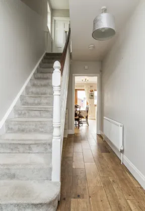 The house benefits from modern PVC windows and doors, oil-fired central heating, and an oil tank situated at the rear of the property. The attic space also offers potential for further improvements. A hot press with an insulated cylinder enhances the home’s energy efficiency.