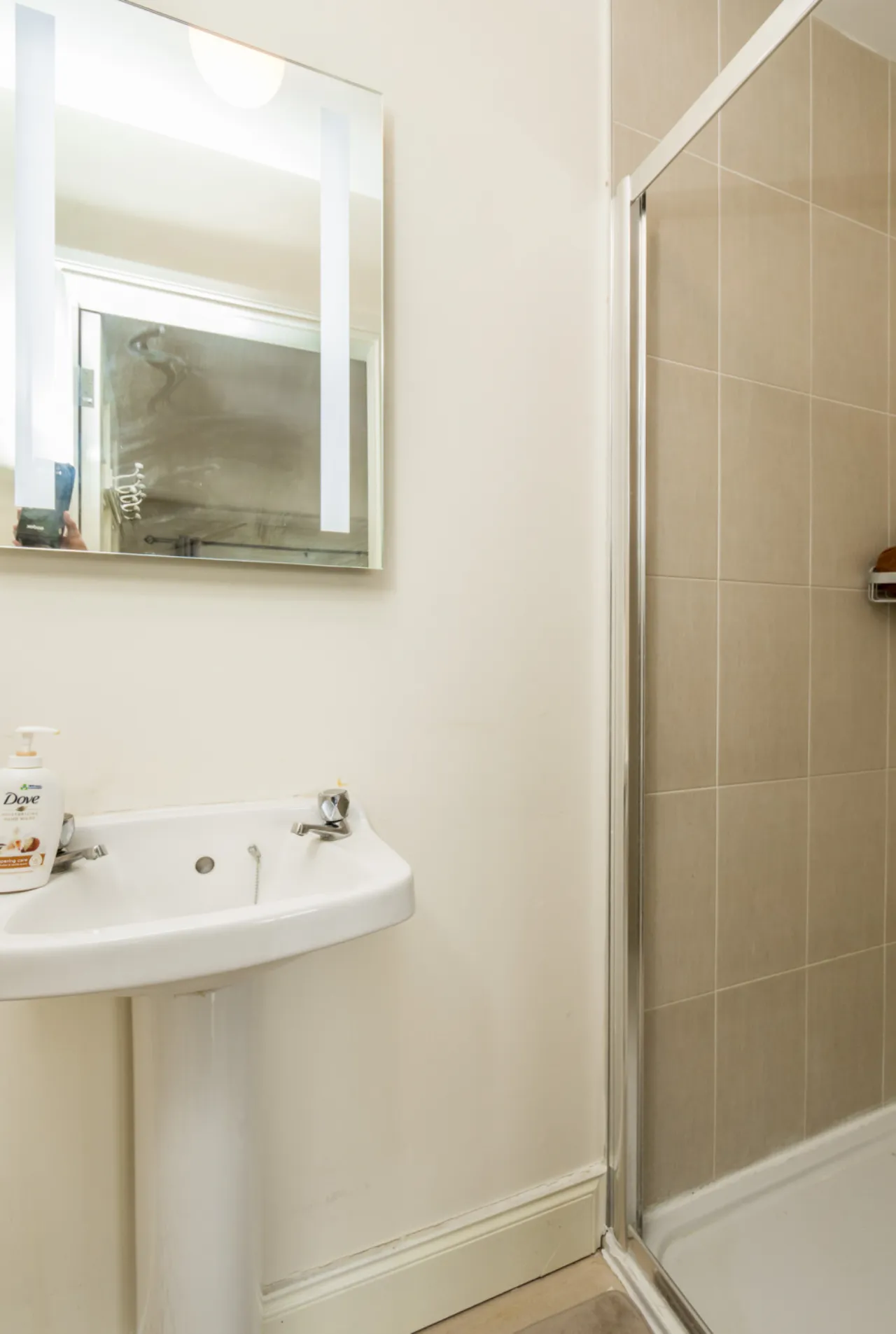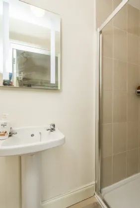 En-Suite 0.88 x 3.21m Tiled floor. Fitted with WC WHB and Shower enclosure with mixer shower.